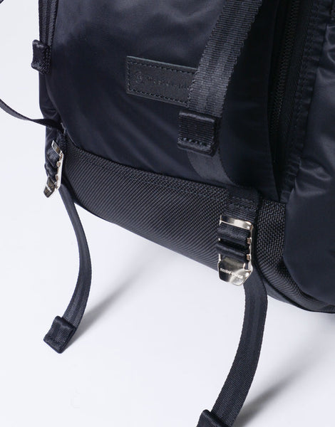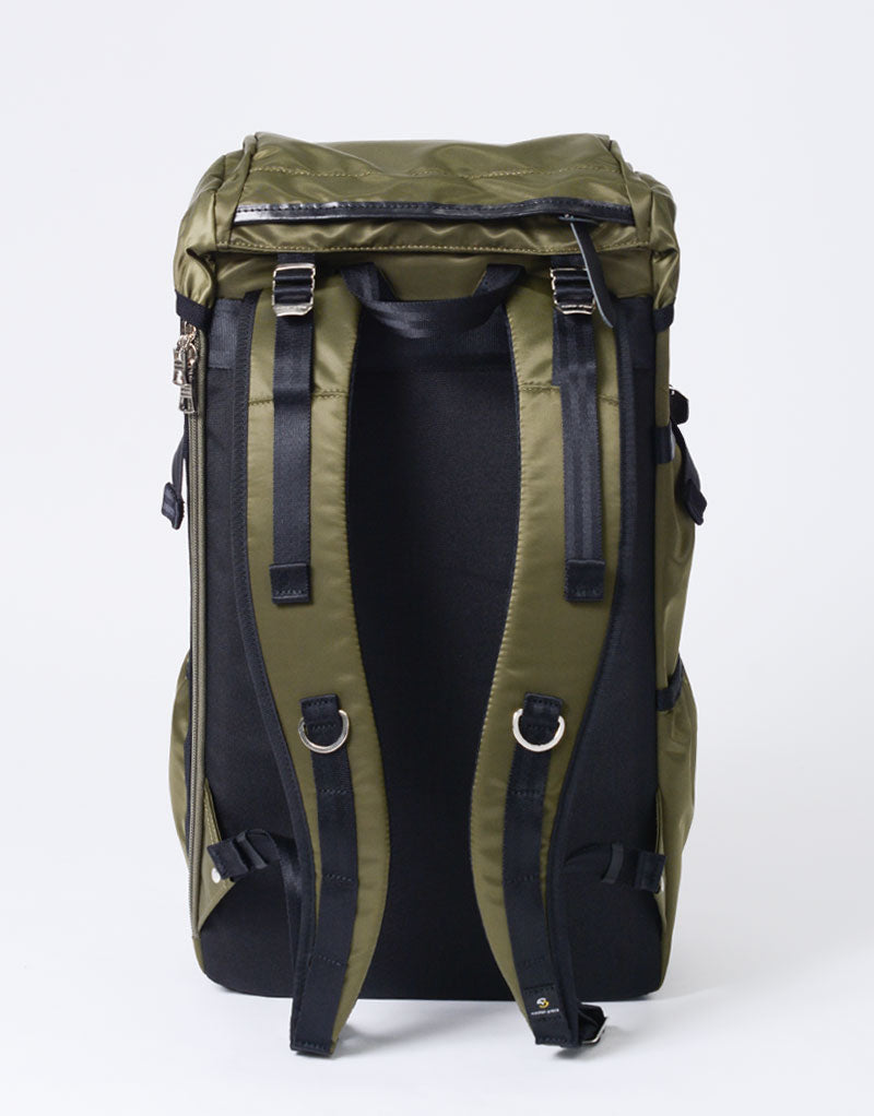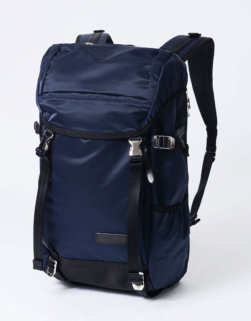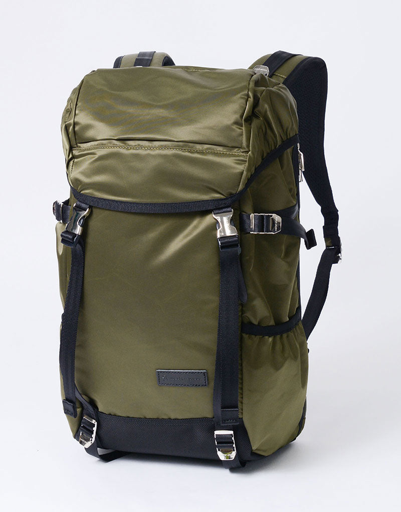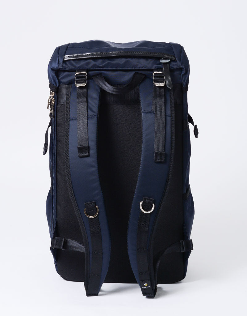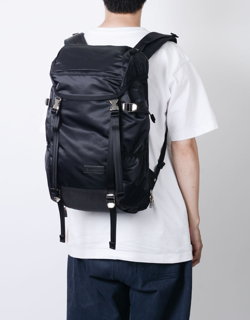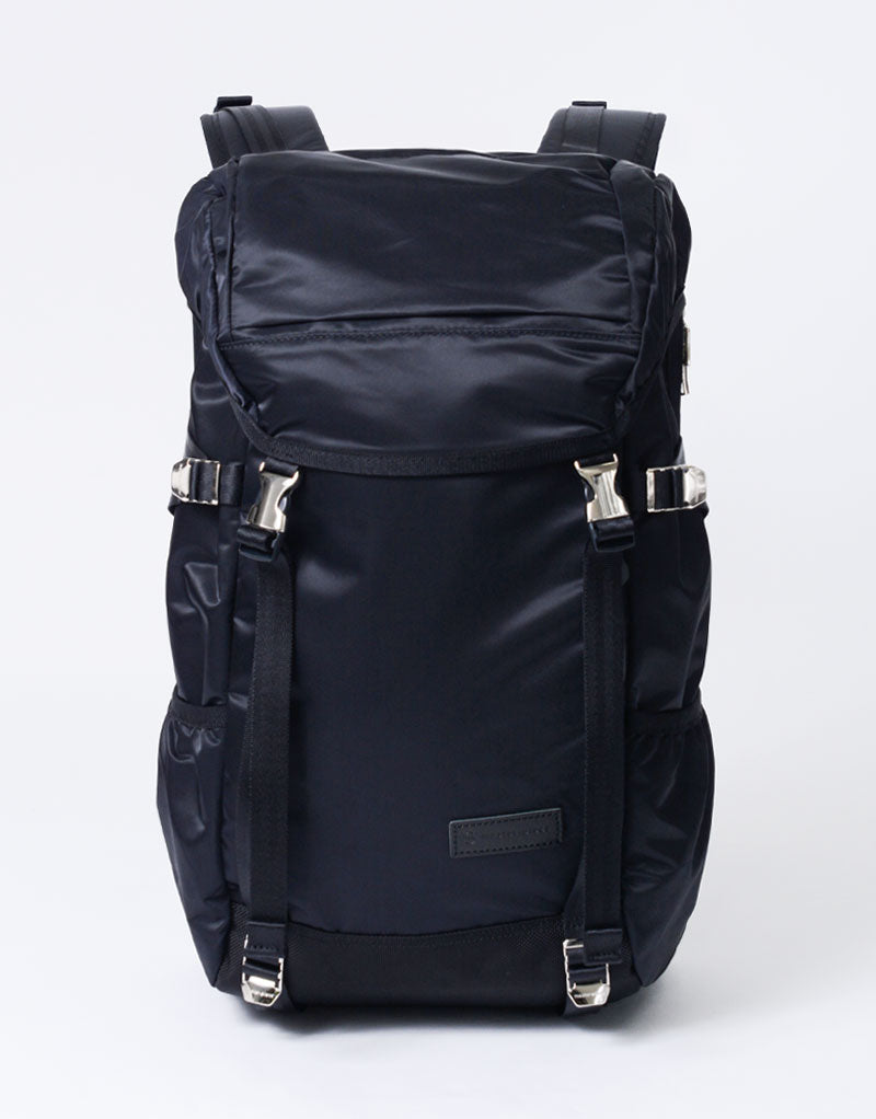 This series is characterized by its elegant sheen from the ultra high-density nylon twill, combined with military-inspired details highlighted by metal parts.