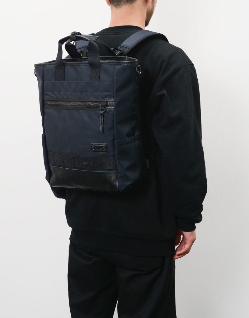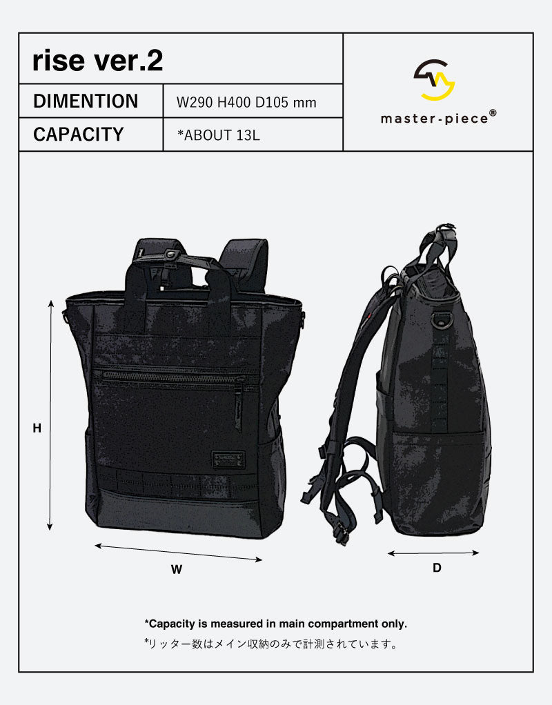 master-piece using the original 3 layer fabric "Mastertex" that combines high-dimensional durability, water resistance, and water repellencyRISE Ver.2 series. The attached leather uses leather that has passed the "Scotchgard" monitoring test, which has excellent waterproofing effects. It is a simple square -shaped design and can be used as a Tote Bag or Backpack. Active in practical scenes such as neo business and commuting.
