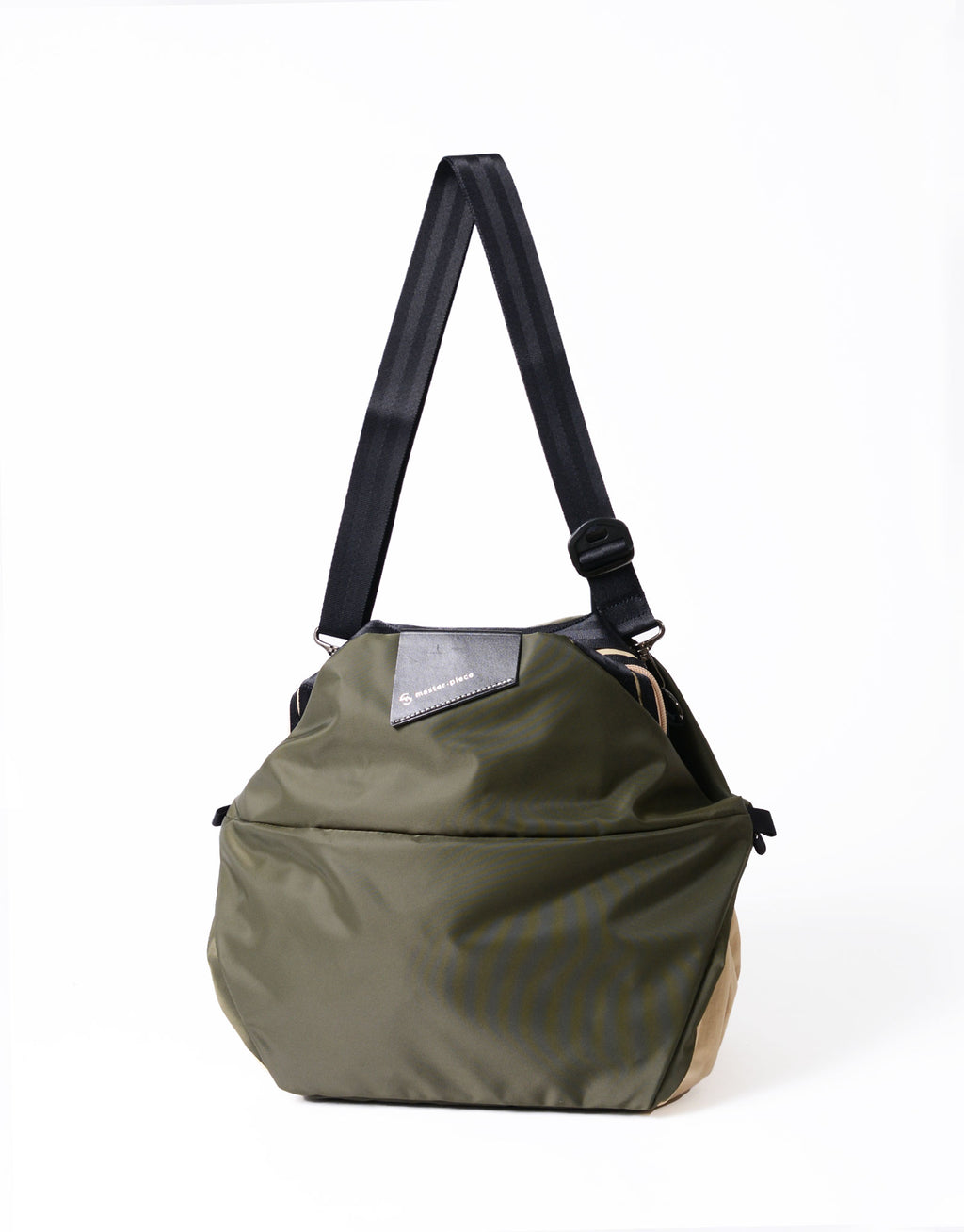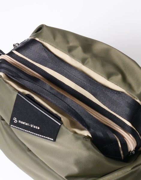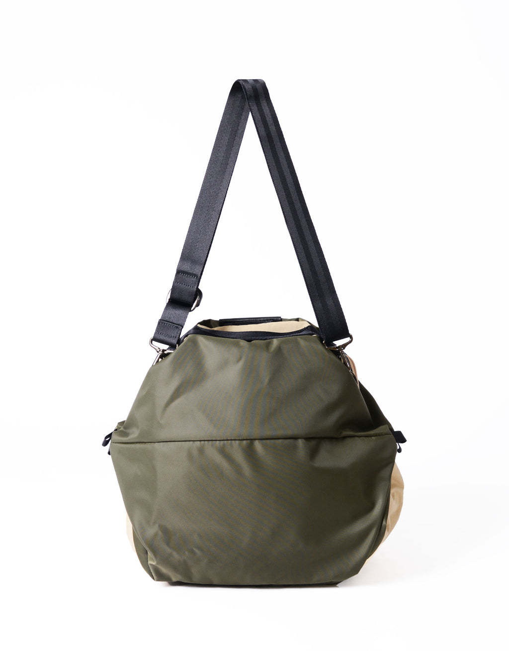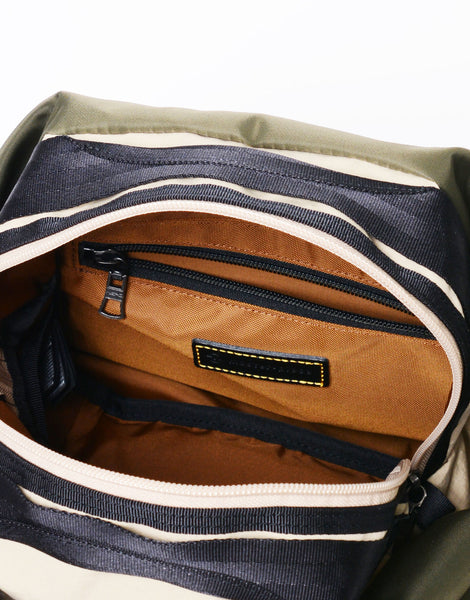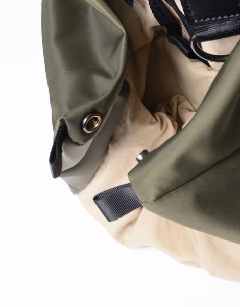 The main body material uses Toray's ECOUSE®, a recycled material made from factory waste, woven with 70d warp and 210d weft semi-dull yarn to create recycled nylon twill.