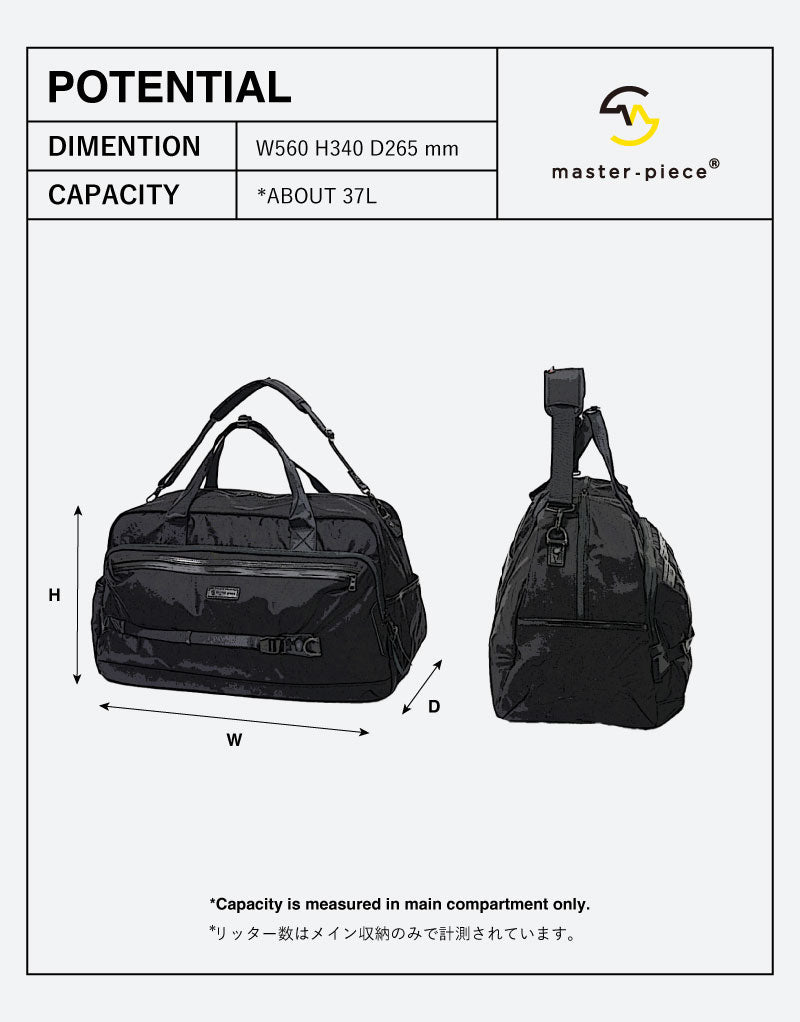 本体素材は CORDURA® brand fabric の生産、品質基準を満たした認定工場において、210d の 66 ナイロン糸を 2 本撚りしたものを、2 本引き揃え、タテ・ヨコに使用し織り上げた、 耐久堅牢度に 優れたオリジナルファブリック、MASTERTEX-07 になります。生地の表面には撥水加工、裏面には特殊透湿防水フィルム L-Vent® をラミネート加工し、トリコットナイ ロンを貼り合わせた 3 レイヤー 構造による耐水圧 20,000mm レベルの防水機能を備えております。またパーツにより、オリジナルファブリックである MASTERTEX-04、05、06 を組 み合わせています。付属素材もレザーは防水鞣しを施したレザーを使用、底面の素材は、通常ナイロンの約 5 倍の摩耗・引き裂き強度・耐久性を持つ INVISTA 社の 1680D コーデュラバ リステック ® ナイロンを使用し、裏面に PVC 加工を施すことで更なる強度と防水性を向上させています。ショルダーハーネスには、荷物の重さを軽減する “m-strap” というオリジナル 機構を装備。身体に触れるクッションの中には NASA のために開発された温度調節素材アウトラスト ® を使用しています。シリーズのデザインポイントであるバックルは、より強度をあ げた新設計のものを採用。デザイン面ではソリッドに、街で使用することを考慮した素材や収納と言った機能面をアップデートした master-piece のフラッグシップシリーズです。