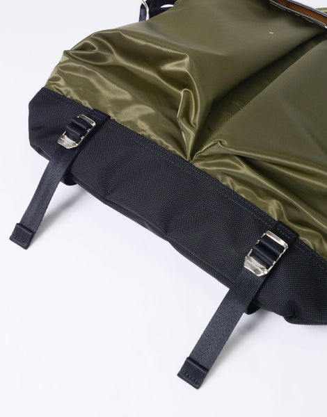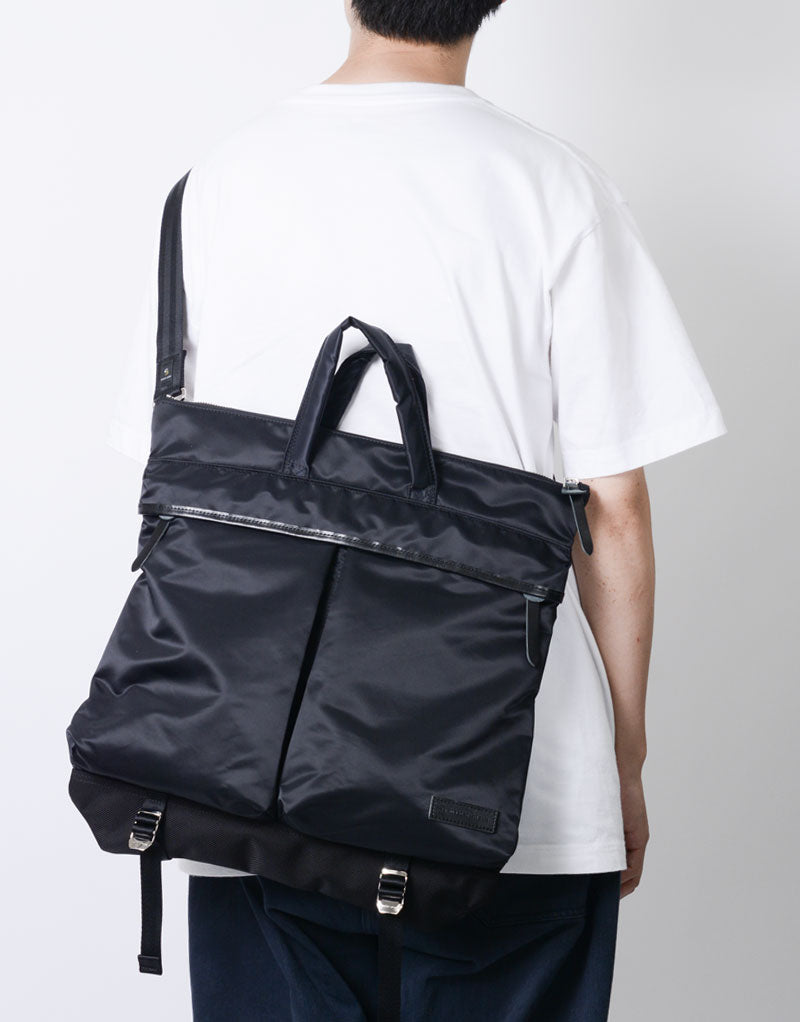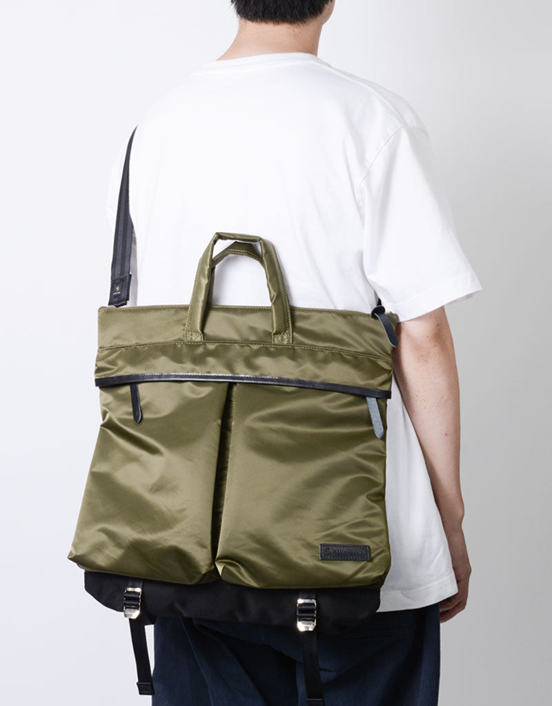 本体素材には、タテ糸に70d、ヨコ糸に210d のナイロンセミダル糸をインチ間でタテ275 本、ヨコ82 本の高密度で織り上げてハリ、コシを持たせた超高密度ナイロンツイルを使用しています。
