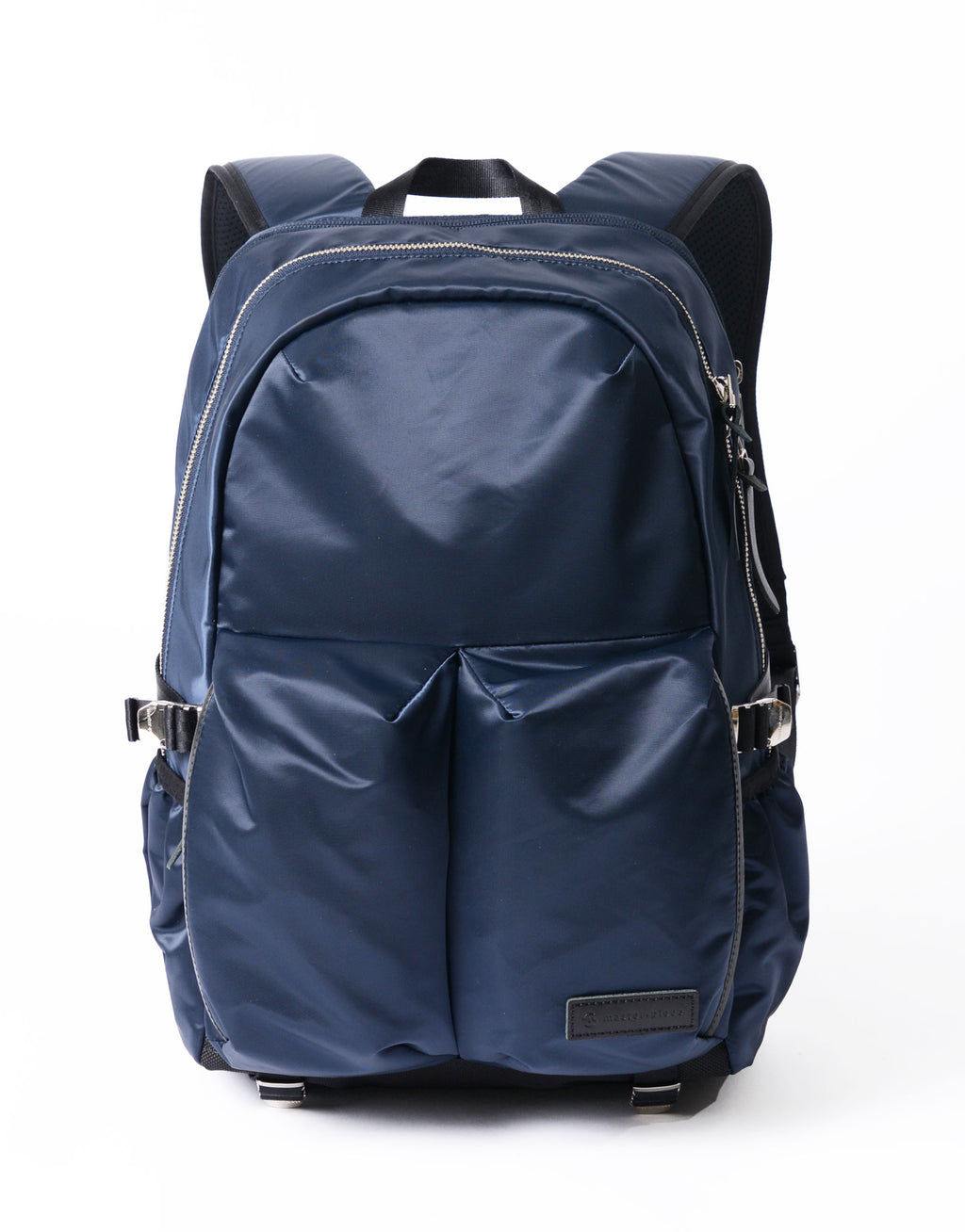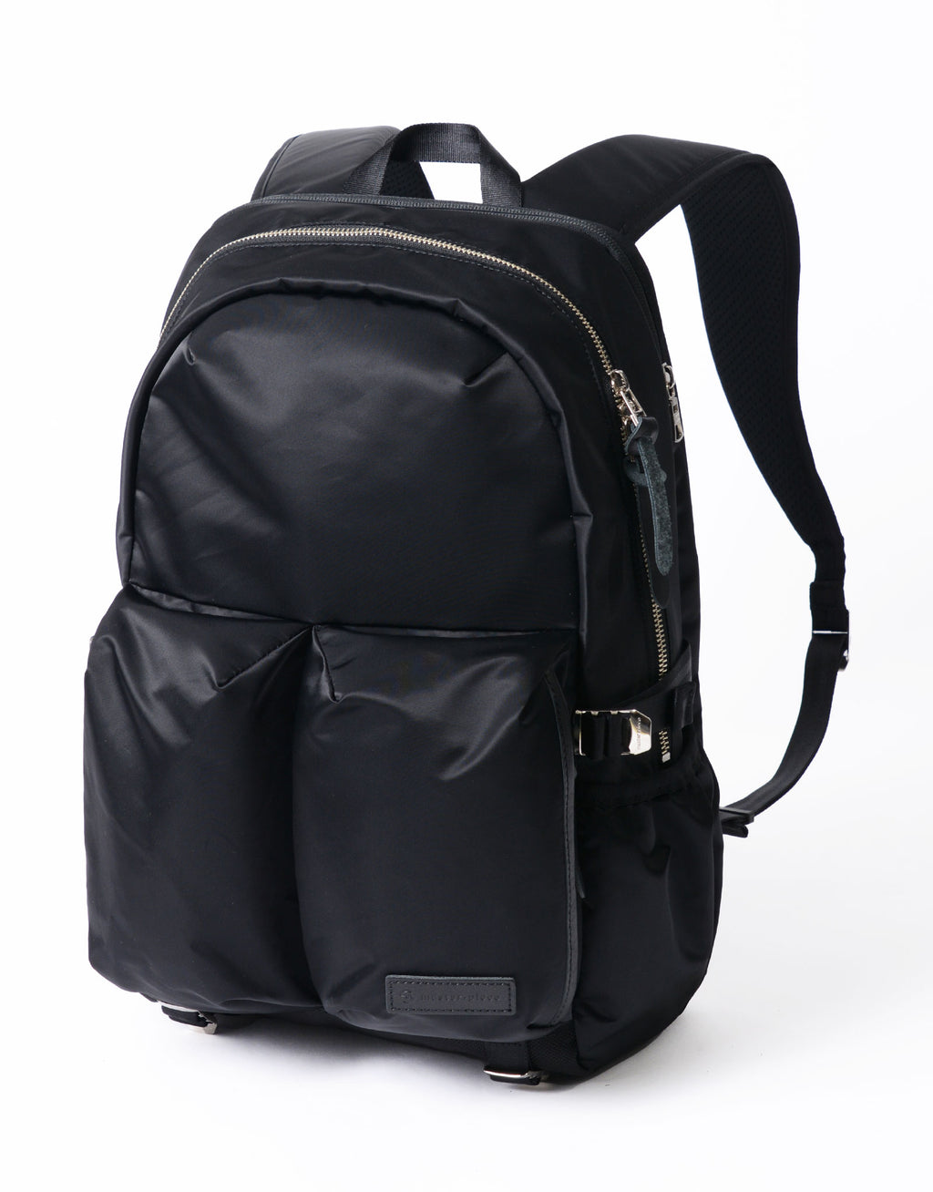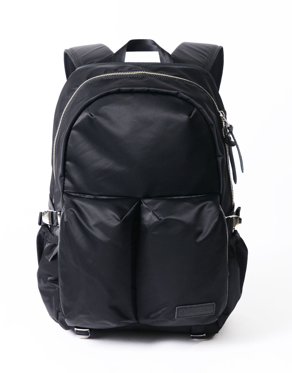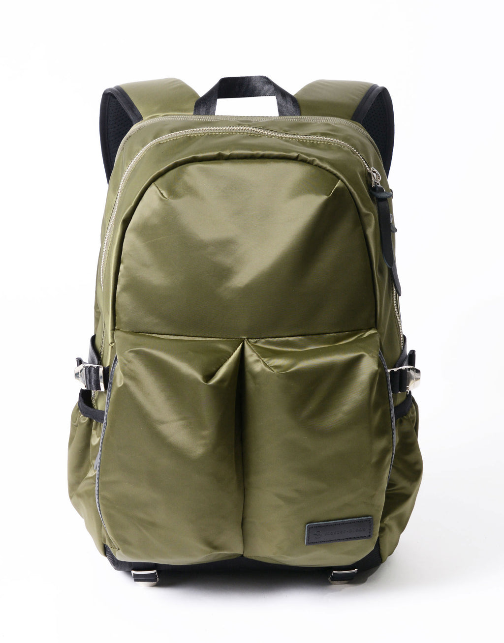 上品なツヤ感を持つ超高密度ナイロンツイルと、金属パーツが印象的なミリタリーテイストのデイパック。