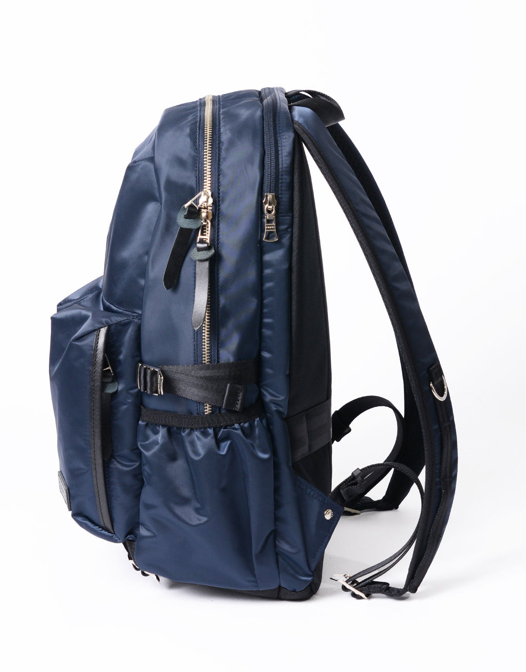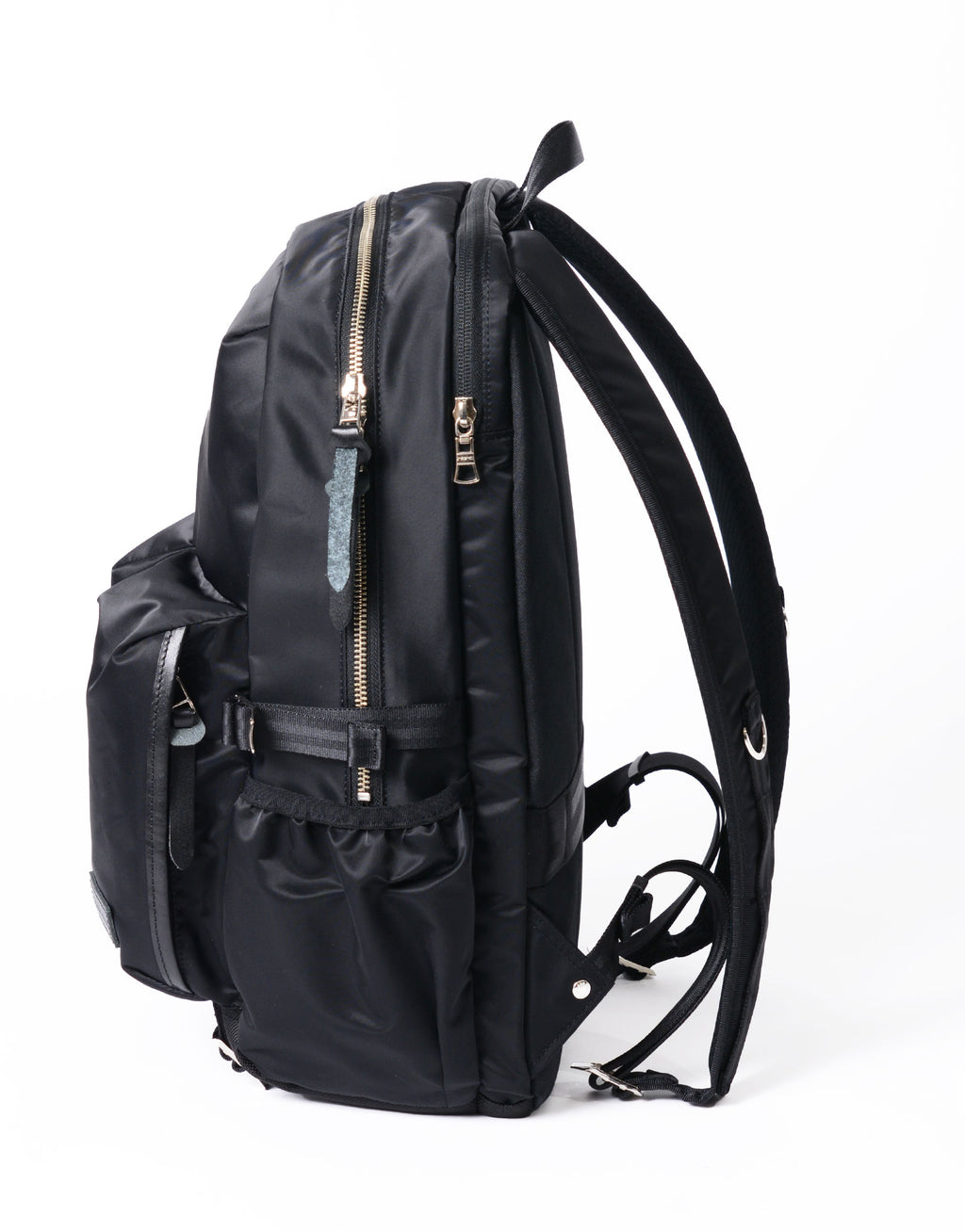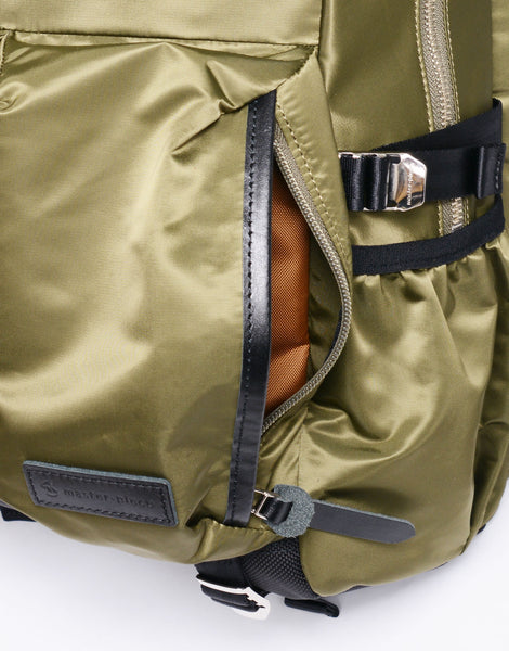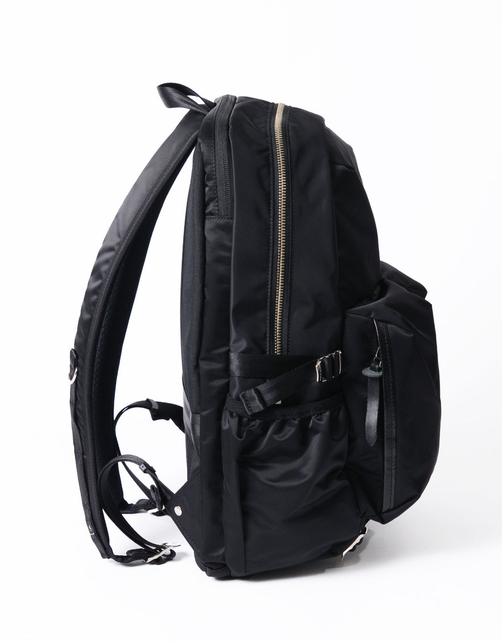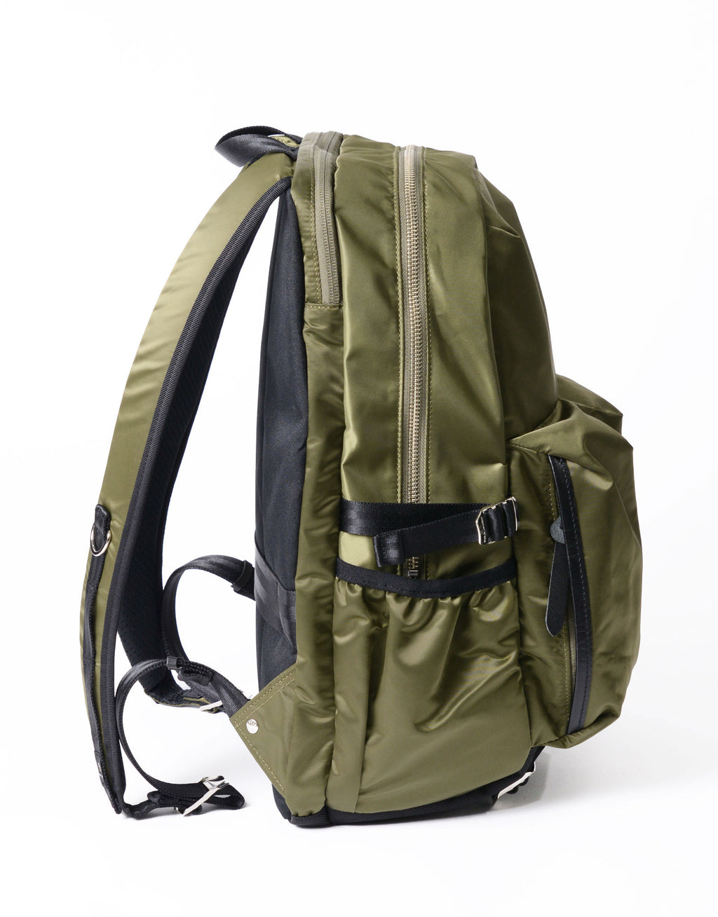 上品なツヤ感を持つ超高密度ナイロンツイルと、金属パーツが印象的なミリタリーテイストのデイパック。