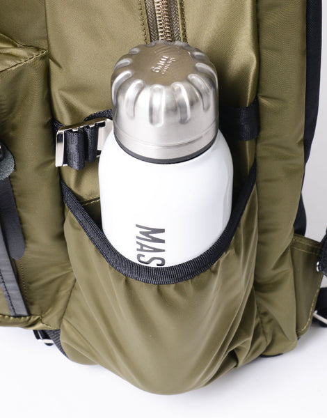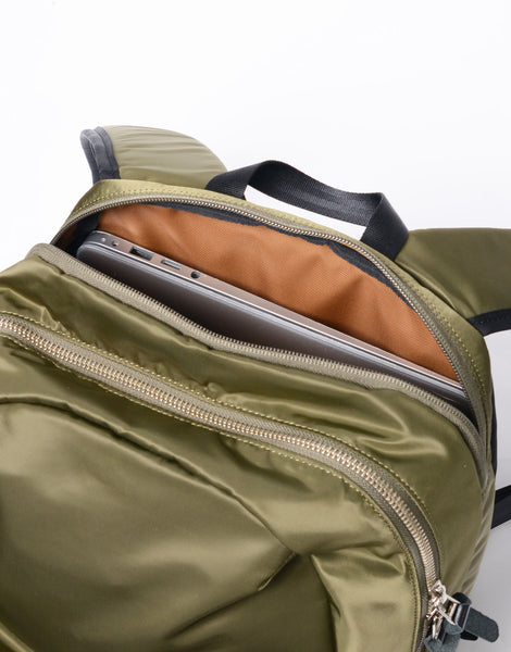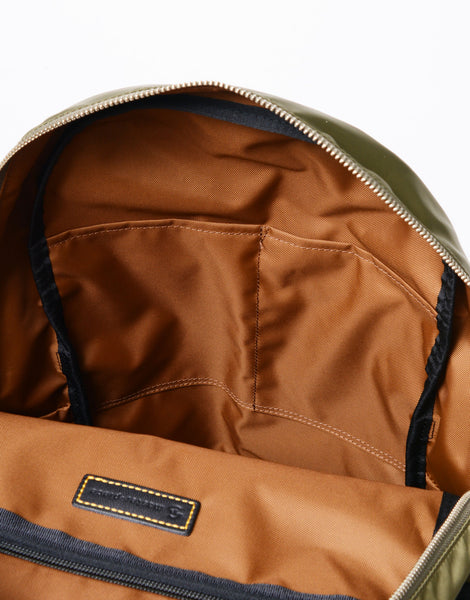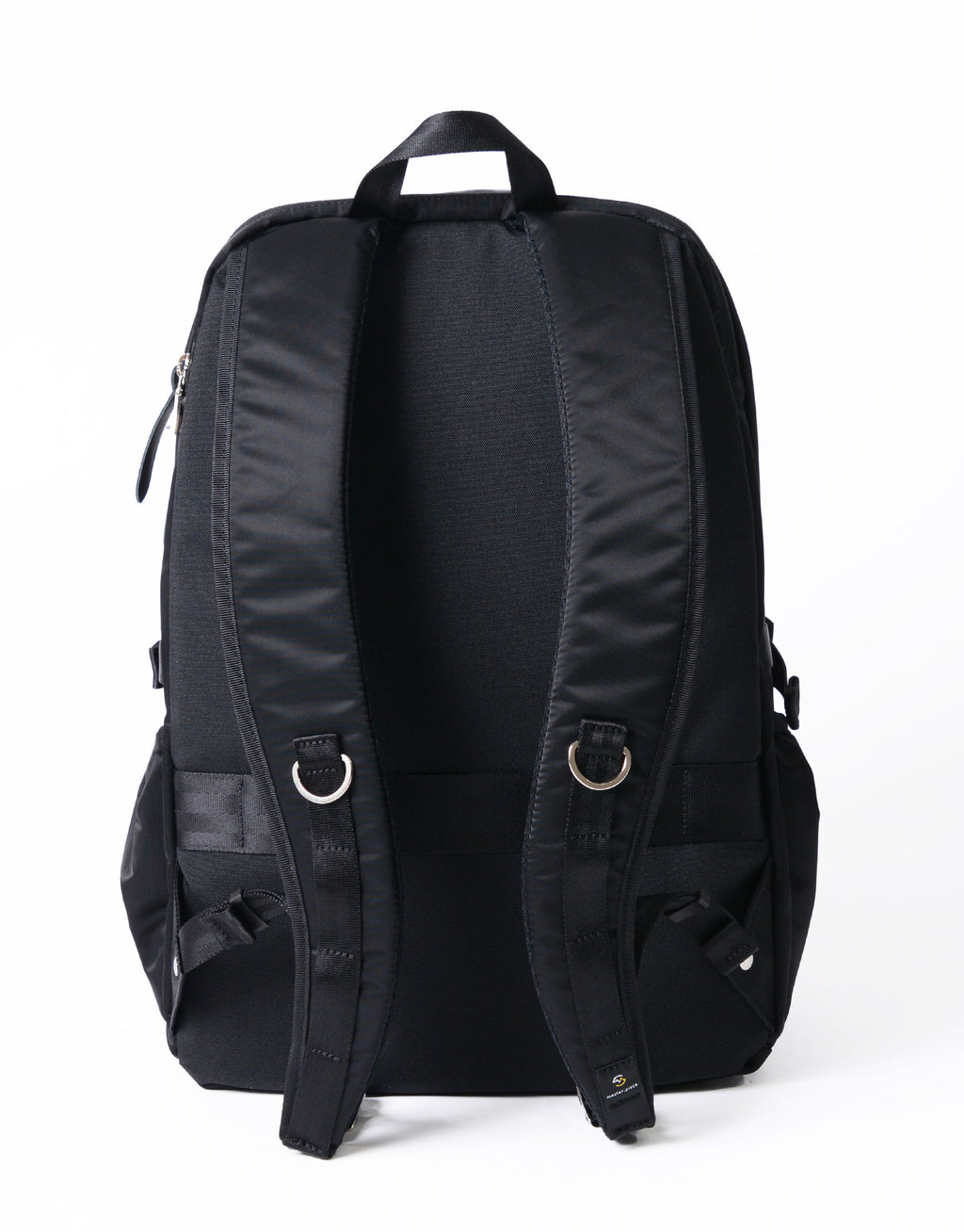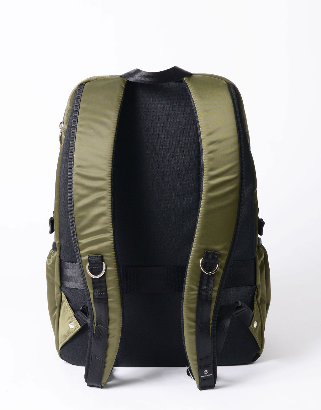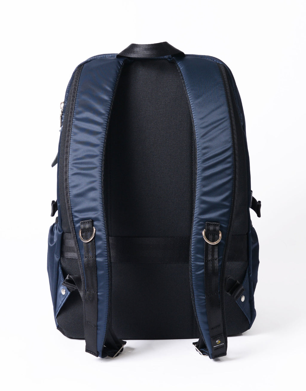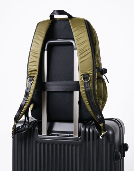 上品なツヤ感を持つ超高密度ナイロンツイルと、金属パーツが印象的なミリタリーテイストのデイパック。