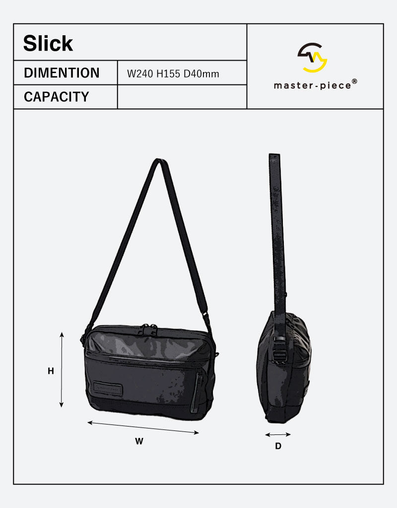 ビジネスシーン、カジュアルシーンを問わず様々なシチュエーションで発揮される機能性、デザイン性を合わせ持ったmaster-piece(マスターピース)の定番シリーズslick(スリック)。シンプルで幅広いスタイリングやシーンに合わせやすいショルダーバッグです。