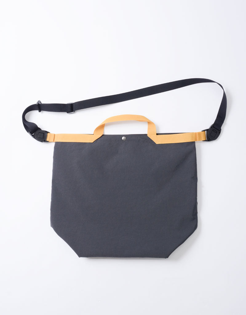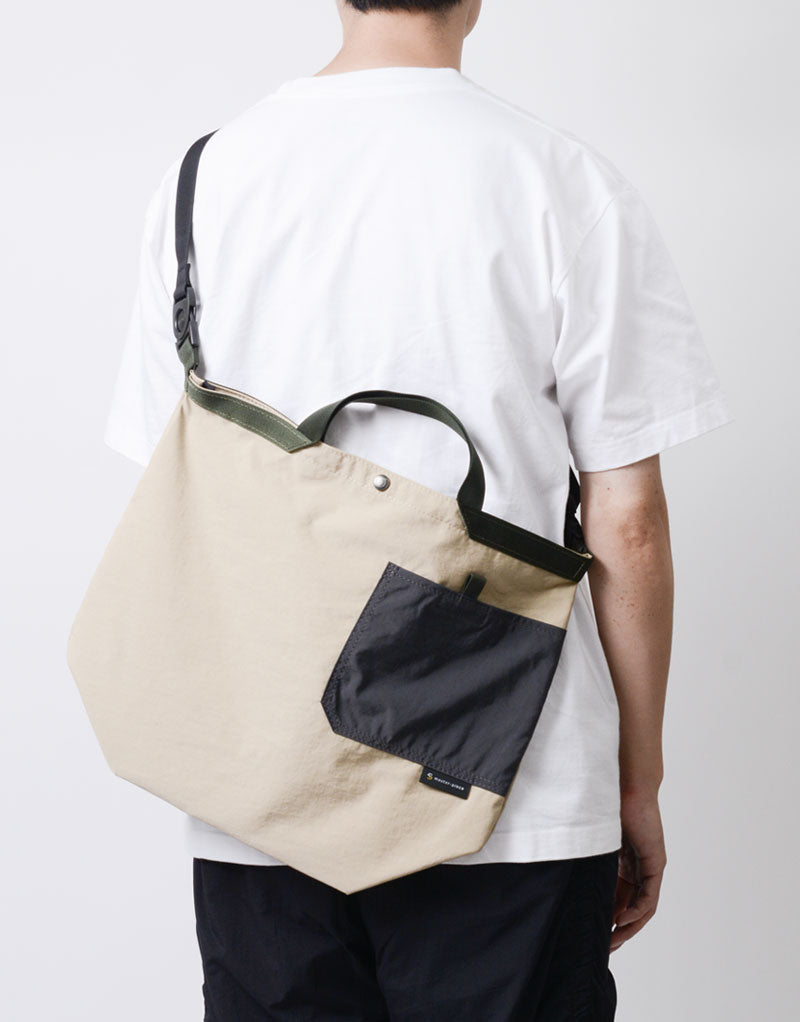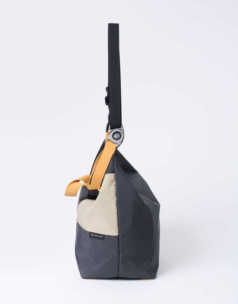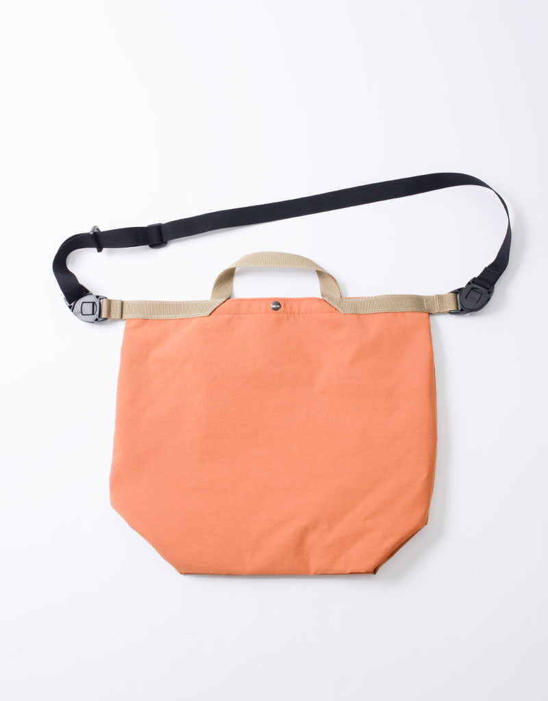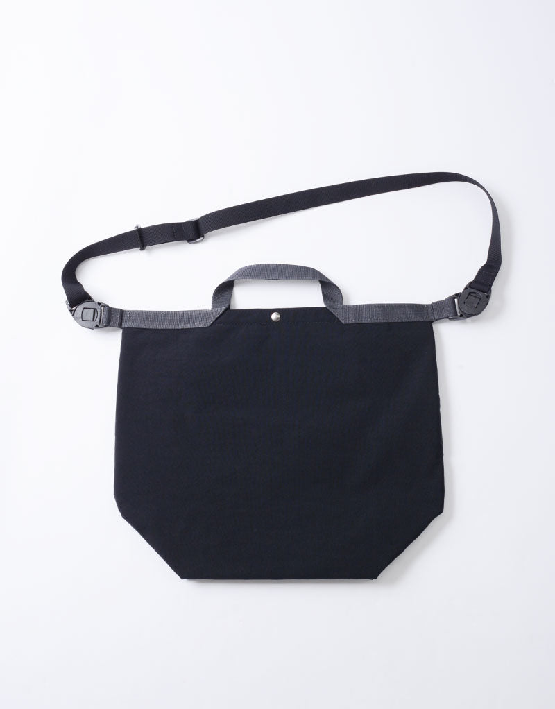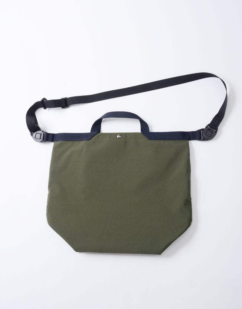 シリーズ最大の特徴である、底に設けたホックを留めることでマチを無くしたり、違うシルエットに変形することができます。またショルダーベルトを外し、本体のバックルを止めることで違うニュアンスで使用することもできます。
