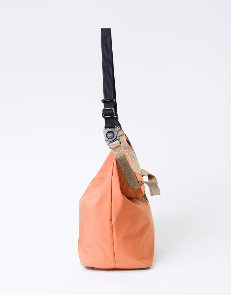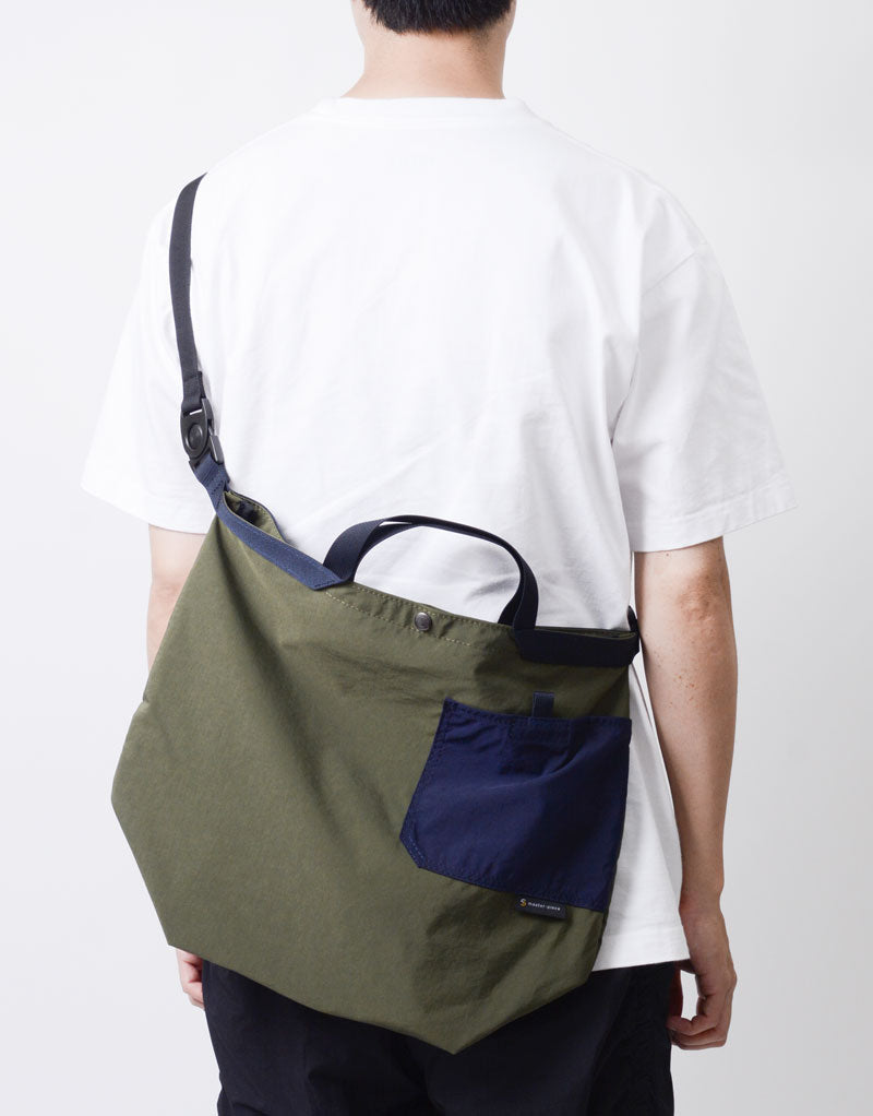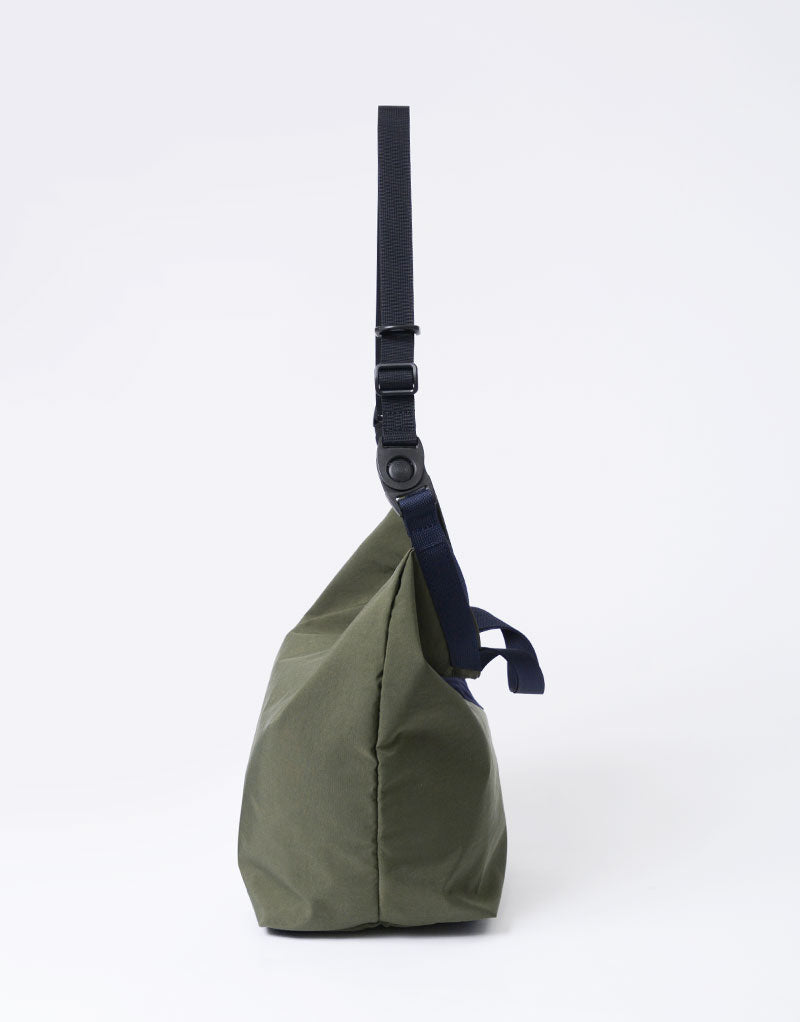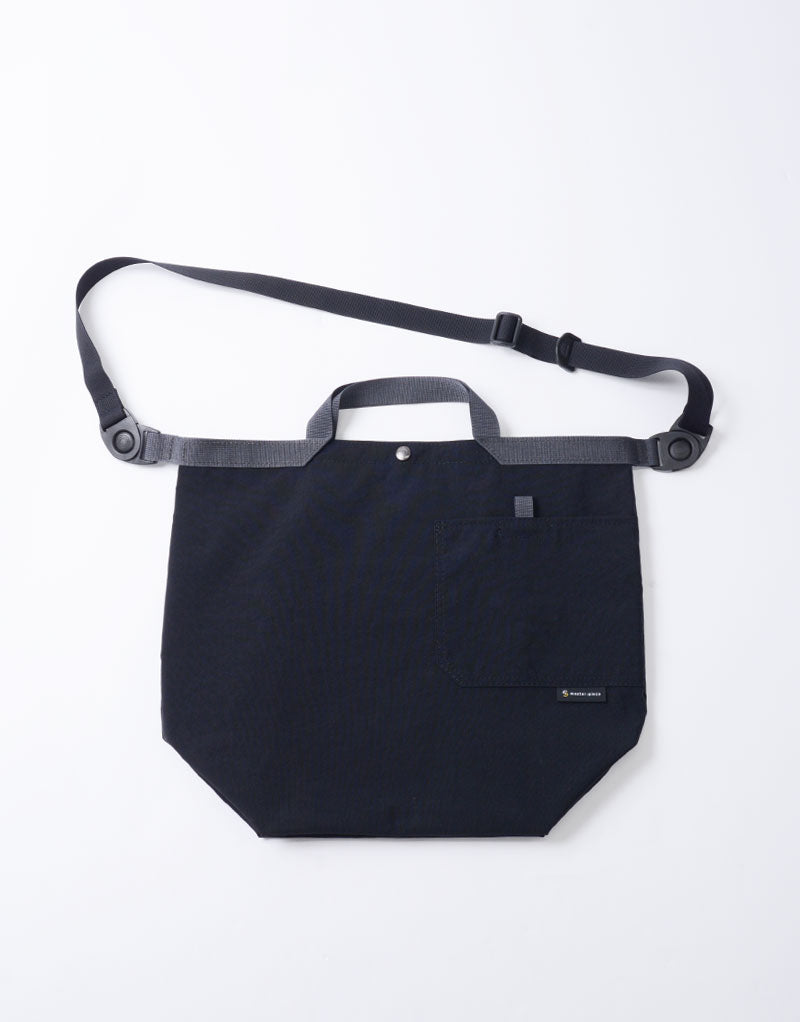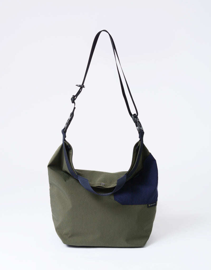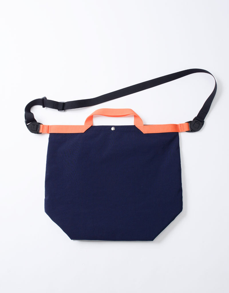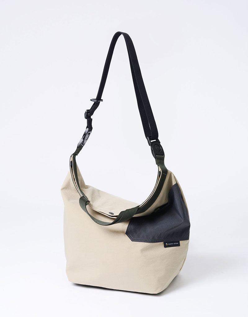 シリーズ最大の特徴である、底に設けたホックを留めることでマチを無くしたり、違うシルエットに変形することができます。またショルダーベルトを外し、本体のバックルを止めることで違うニュアンスで使用することもできます。