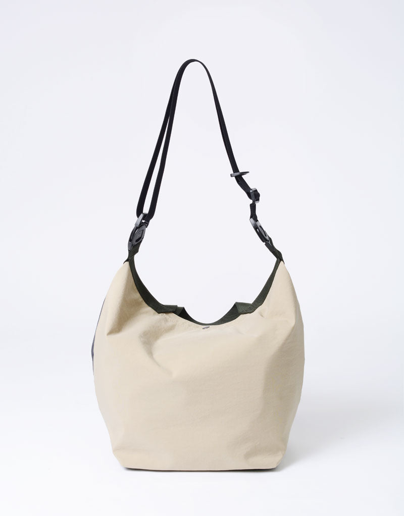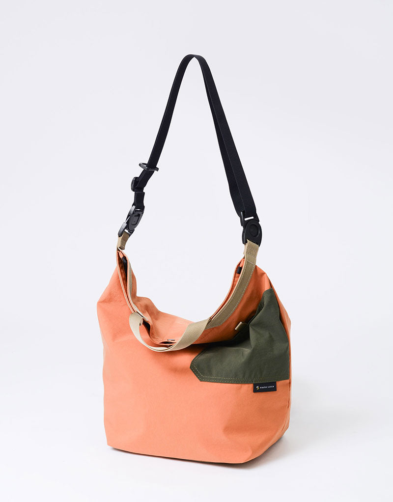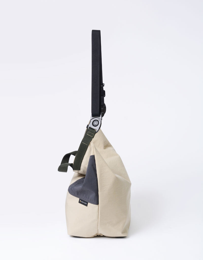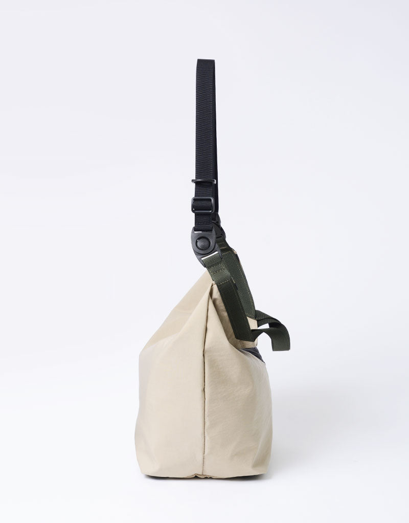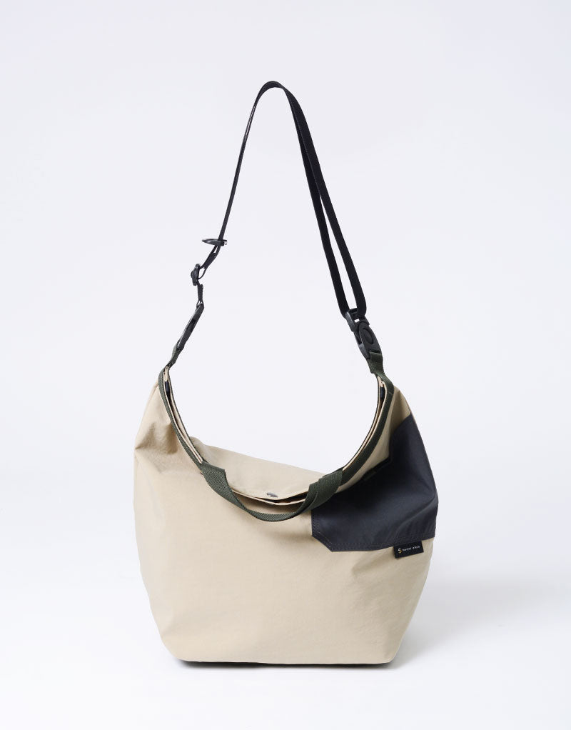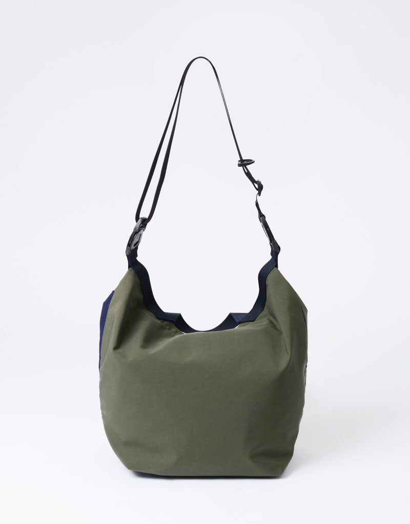 シリーズ最大の特徴である、底に設けたホックを留めることでマチを無くしたり、違うシルエットに変形することができます。またショルダーベルトを外し、本体のバックルを止めることで違うニュアンスで使用することもできます。