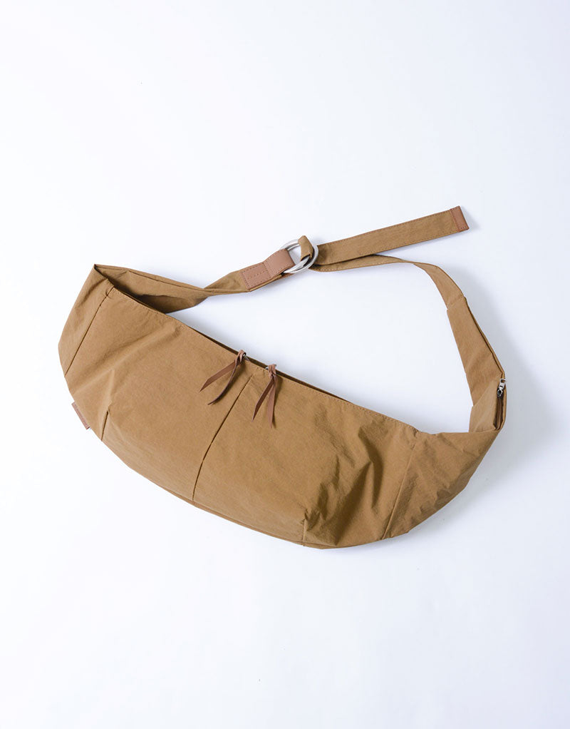 本体生地には、製造工程において発生した廃棄物を再利用したプレコンシューマ・リサイクルナイロン糸を平織りした生地に小松マテーレ(株)のKONBU ®-Nという特殊加工を施した素材を使用。自立するほどの硬度と引き裂きへの強度がありながら手に持ってみると驚くほどの軽さがあることが特徴です。