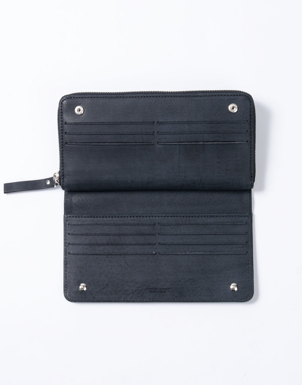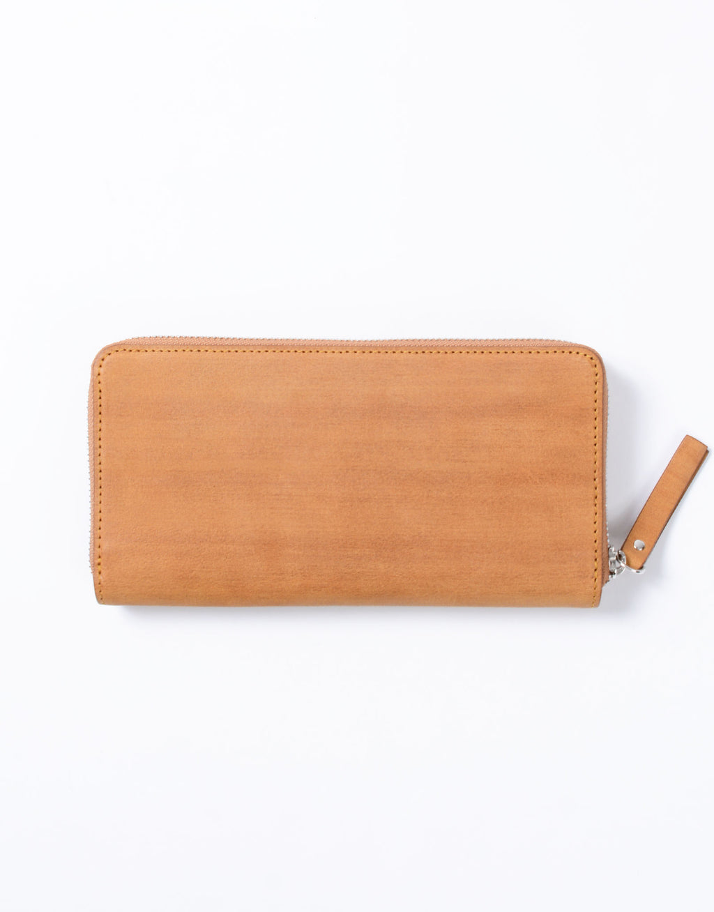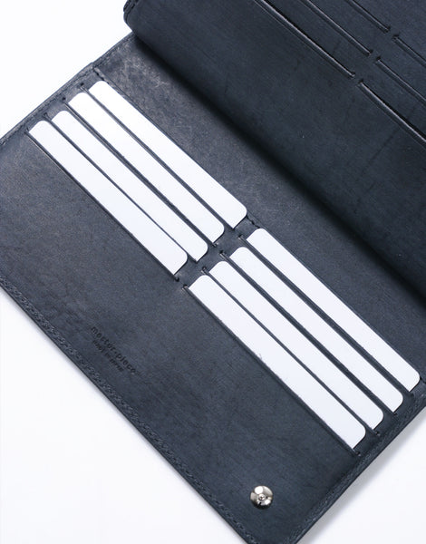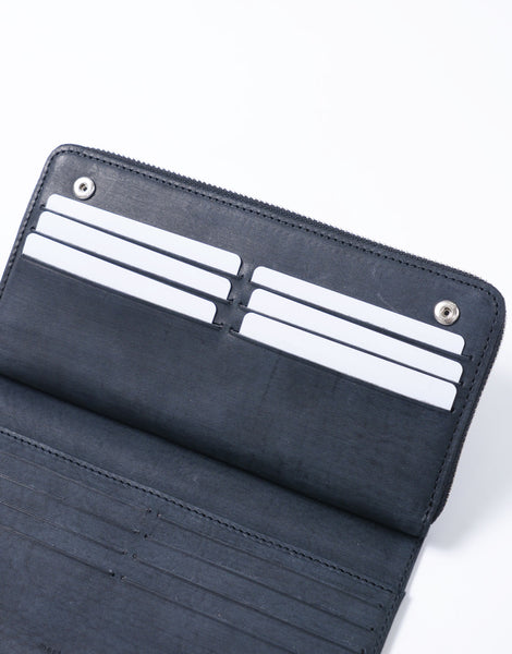 職人の手で1 枚1 枚カナブラシを用いてブラッシングをかけられた木目調の表情の革と、ネーム部分のカシメが特徴的なカジュアルウォレットシリーズ。