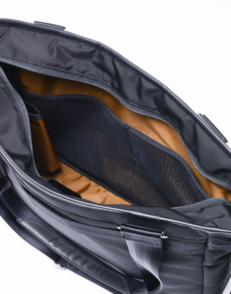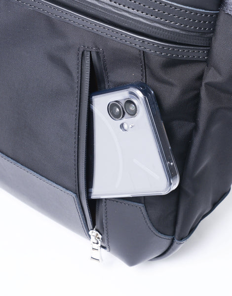 フロント上部のメッシュ式ポケットはワイヤレスイヤホン等の小物の収納に便利。