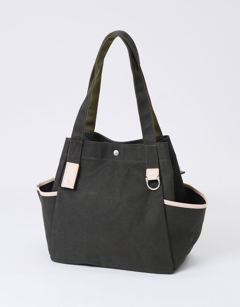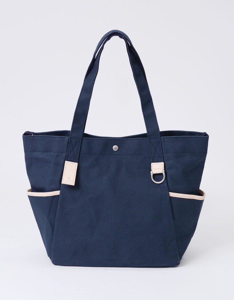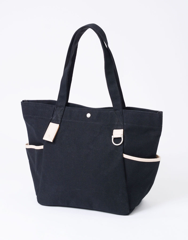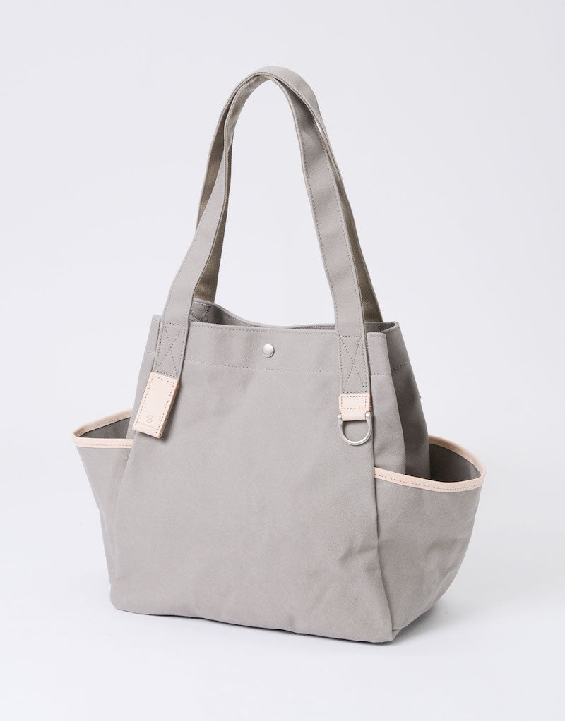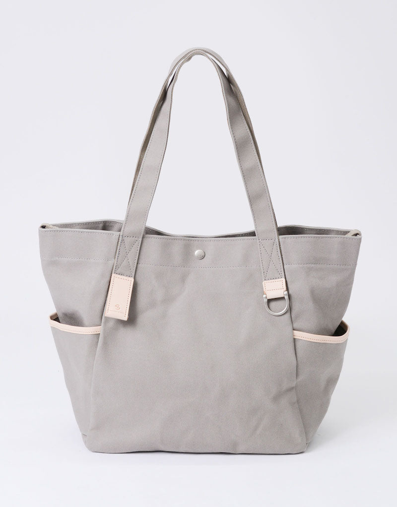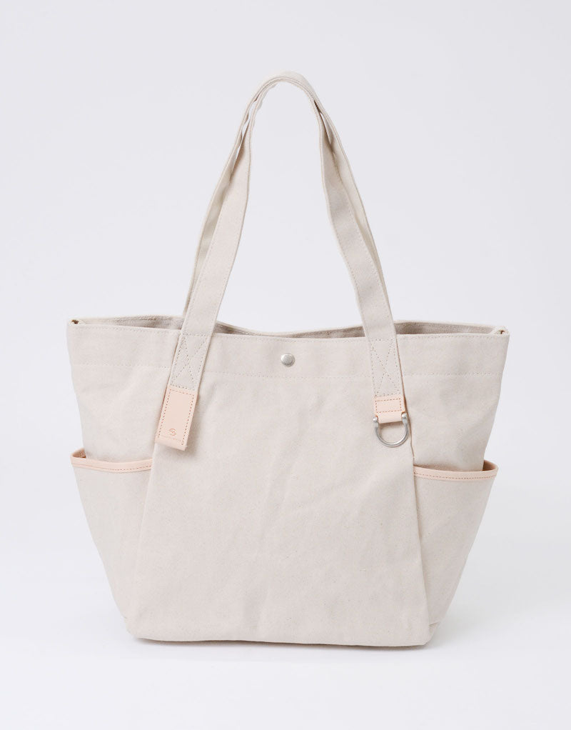 本体の両端にナスカンとDカンがついており、つなぐことで口元が小さくなり、通常のトートバッグとは違ったニュアンスで使用することが可能です。