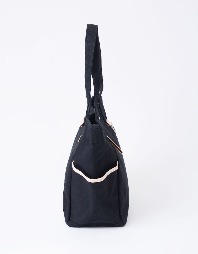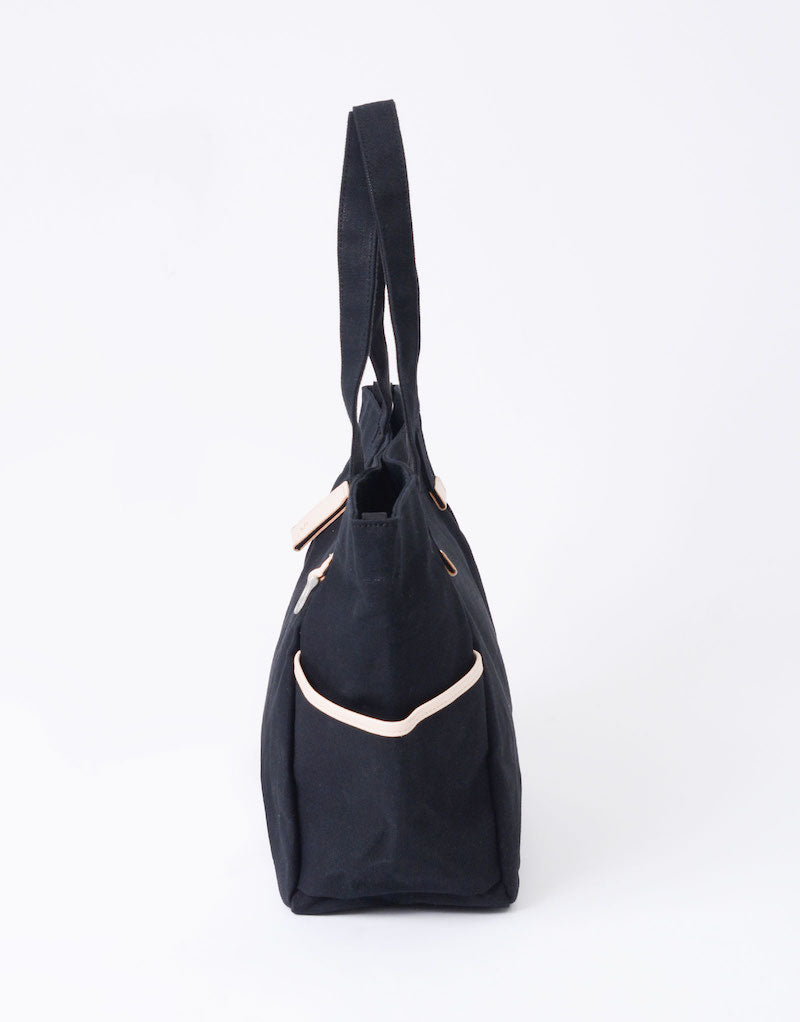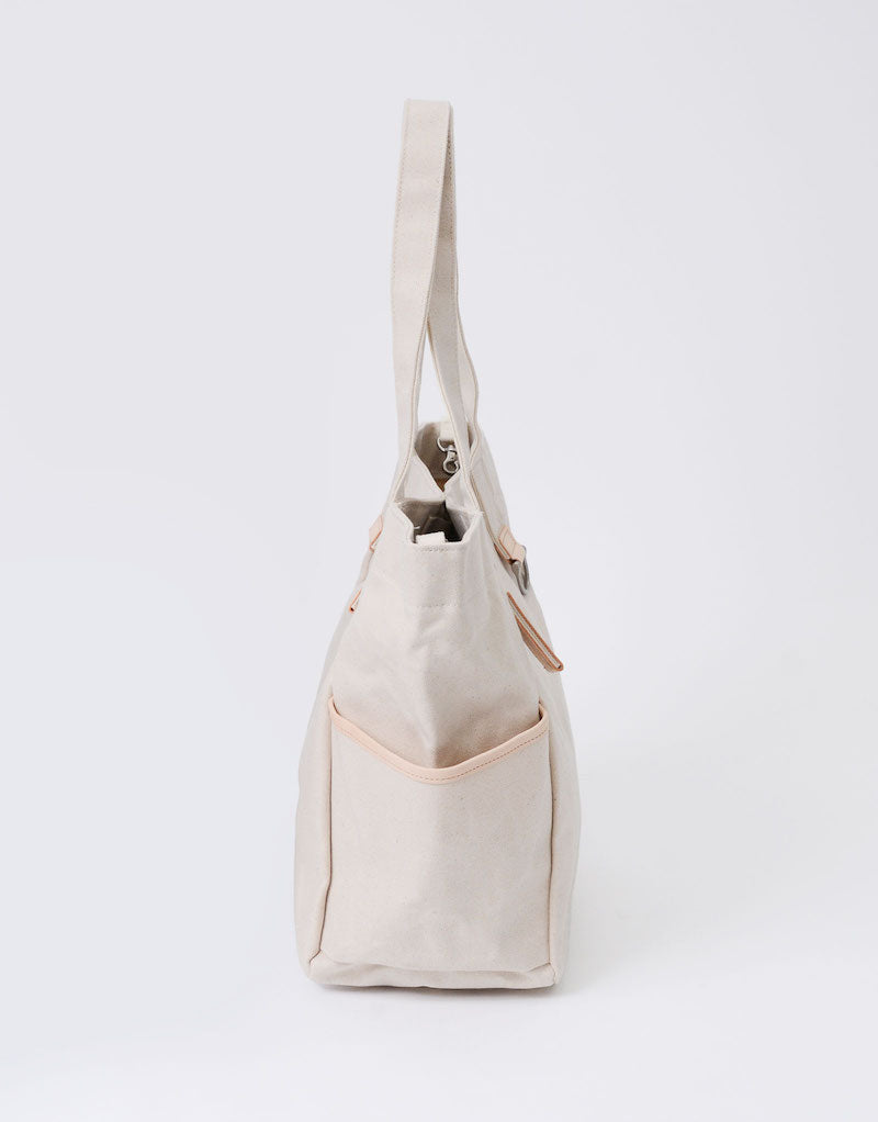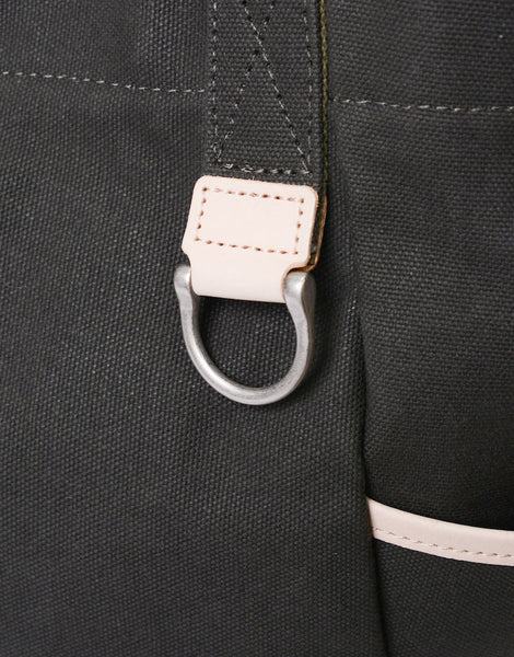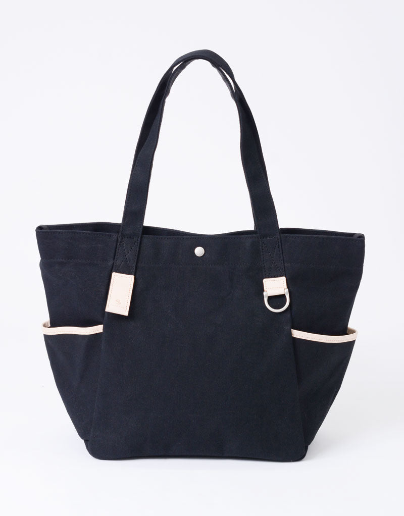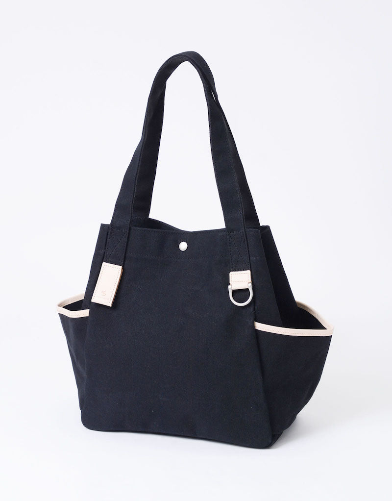 本体の両端にナスカンとDカンがついており、つなぐことで口元が小さくなり、通常のトートバッグとは違ったニュアンスで使用することが可能です。