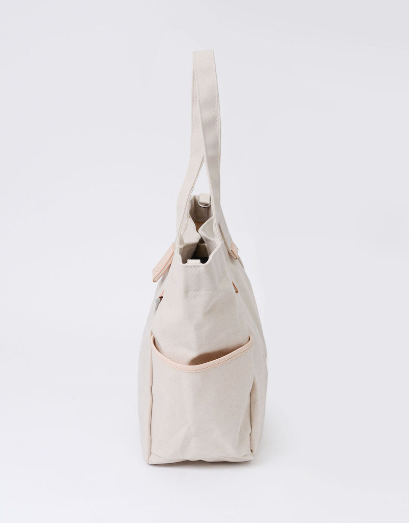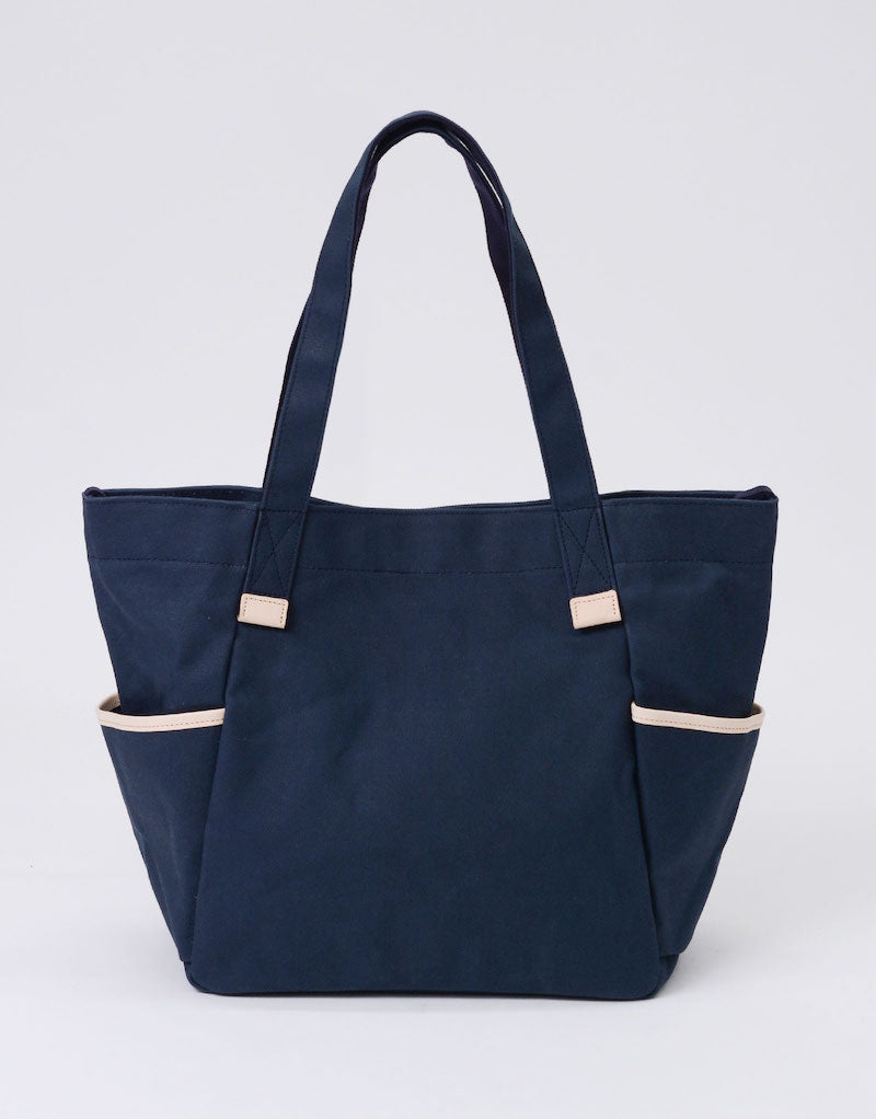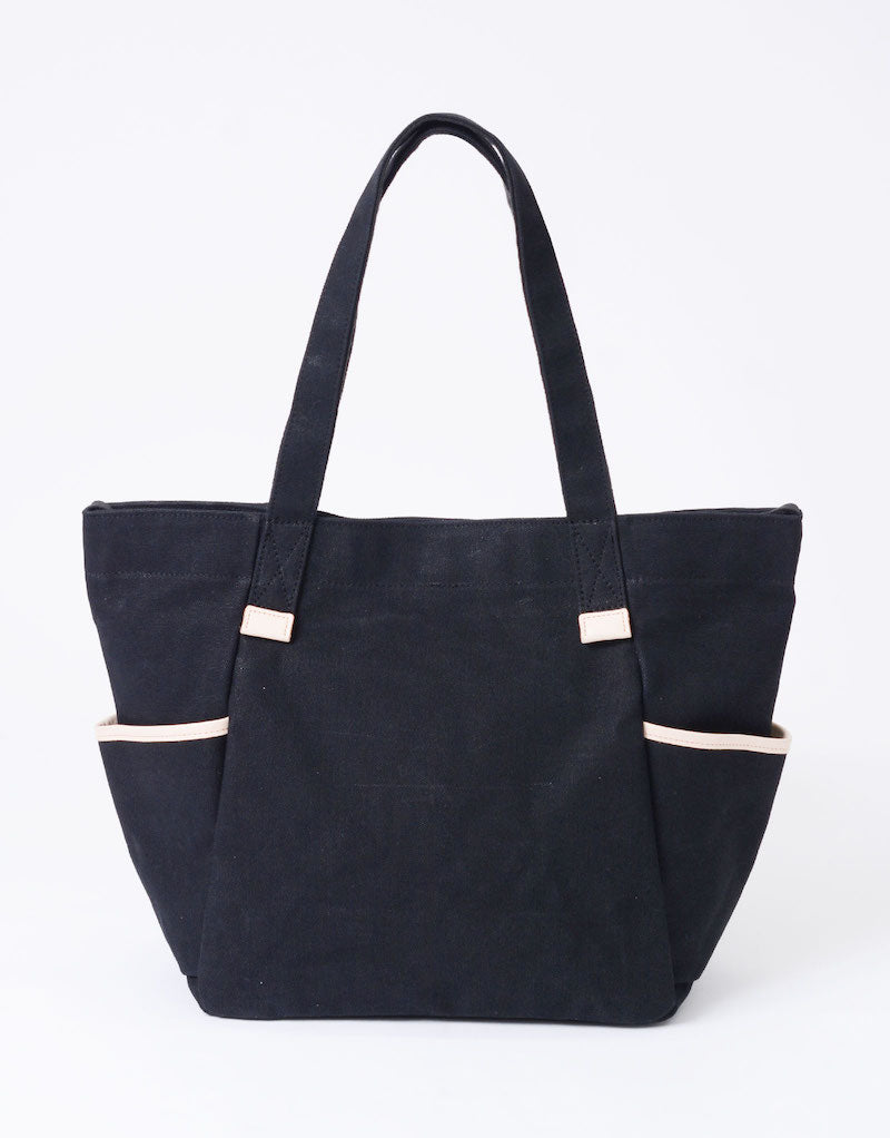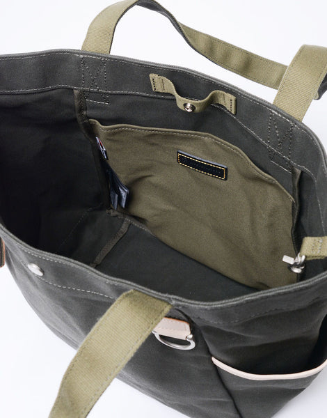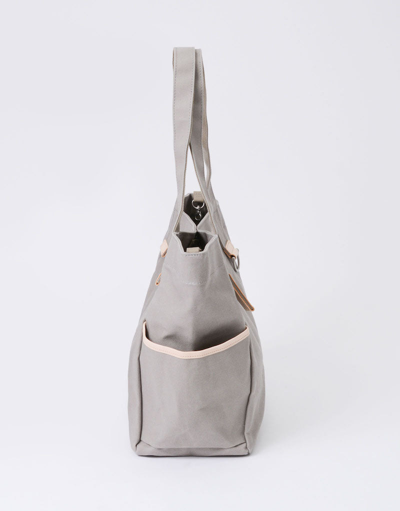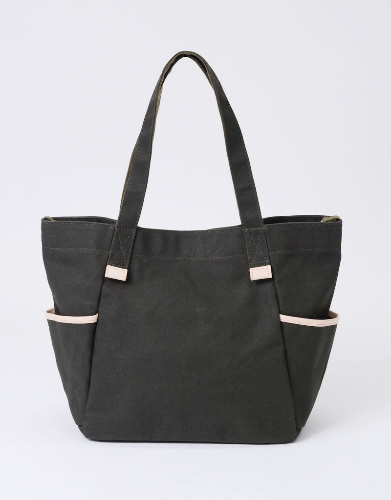 本体の両端にナスカンとDカンがついており、つなぐことで口元が小さくなり、通常のトートバッグとは違ったニュアンスで使用することが可能です。