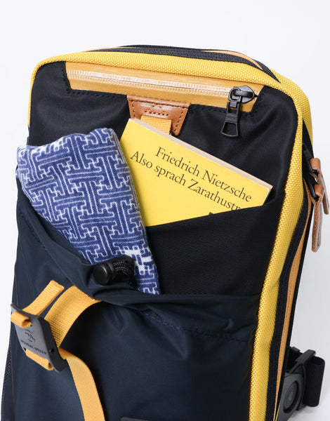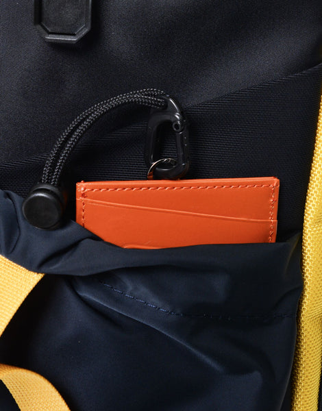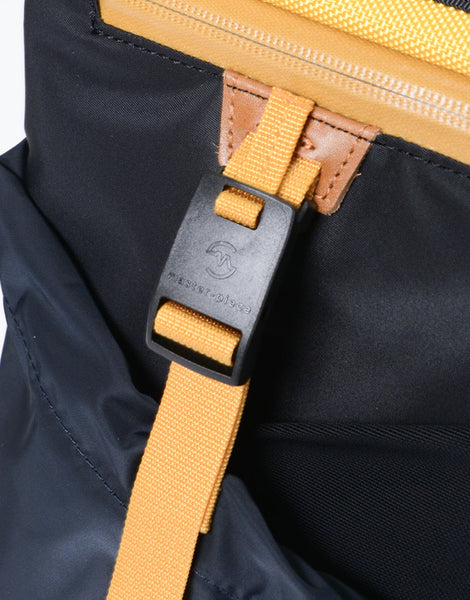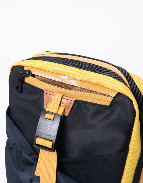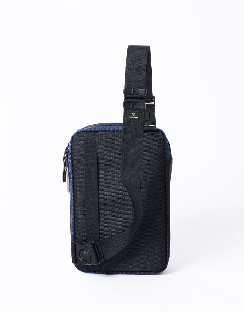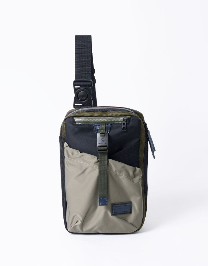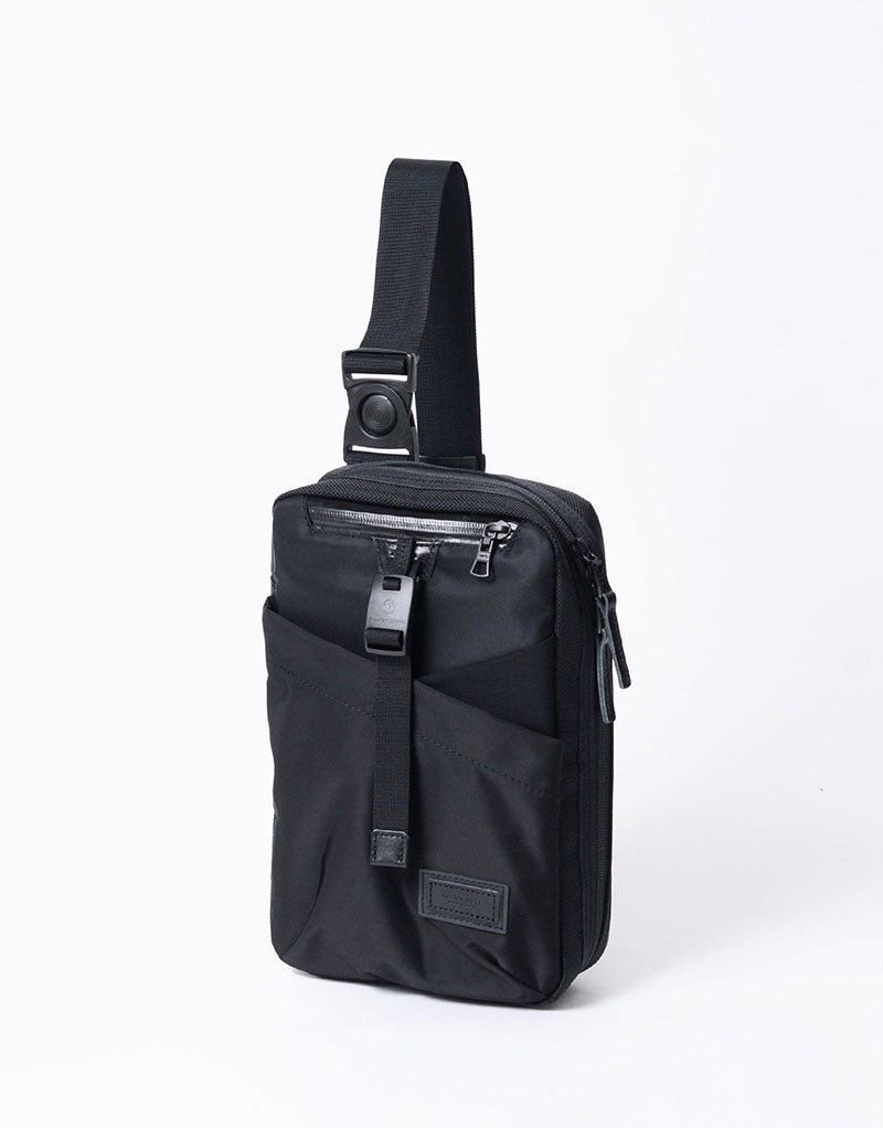 強靭性の高いナイロンと、程よい光沢感のナイロンツイル、再帰反射機能を持たせたレザーネーム、異素材で組み合わされたフロントポケットが特徴的なアイテム。