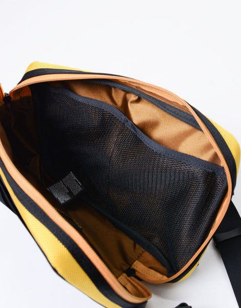 付属の生地は高密度で織ったナイロンツイルで、タテ糸に 110d のセミダル糸を、ヨコ糸に 210d のブライト糸を使用し、2 種類の光沢を持たせることで出る深みのある色が特徴です。