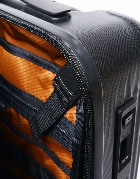 耐衝撃性・耐熱性に優れたポリカーボネート混合樹脂を使用したハードケース。キズが目立ちにくいシボ加工と、強度を高める波型リブを本体に配し、スタイリッシュさと堅牢性を両立しました。ファスナーには、一般的なファスナーの3倍の強度を誇る、対穿刺性・二重構造のYKK®️RCWを採用。内装は取り外し可能な仕切りパネル付きで、旅先ではウォールポケットとしても活用できます。