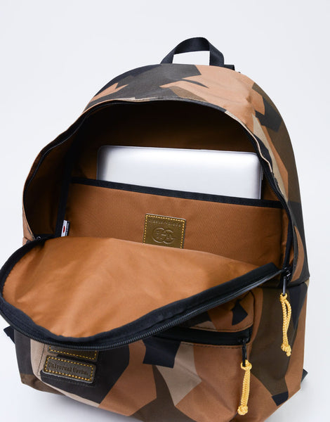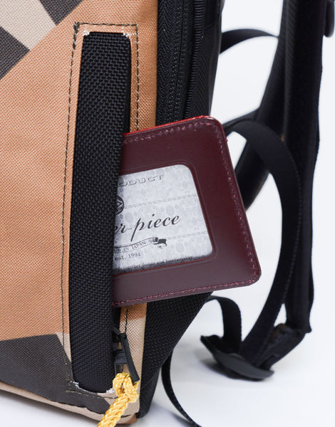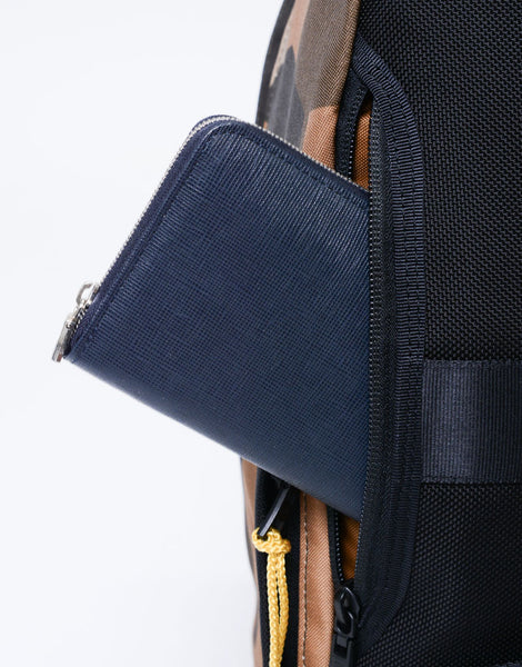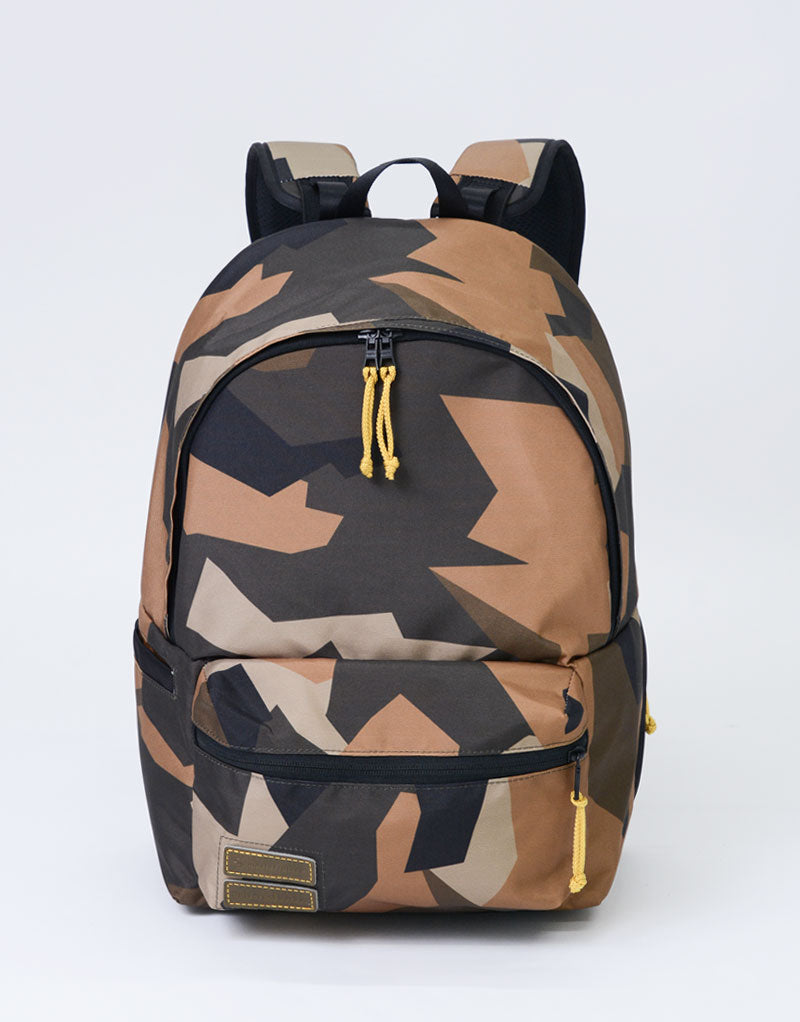 MULTIの本体素材には、タテヨコ共に600dのポリエステル糸をオックス織りした生地に、“Universal Works” がデザインしたオリジナルカモ柄をインクジェット昇華転写プリントし、さらに生地の表面に撥水コート加工を施し耐水性にも考慮した生地を使用しています。