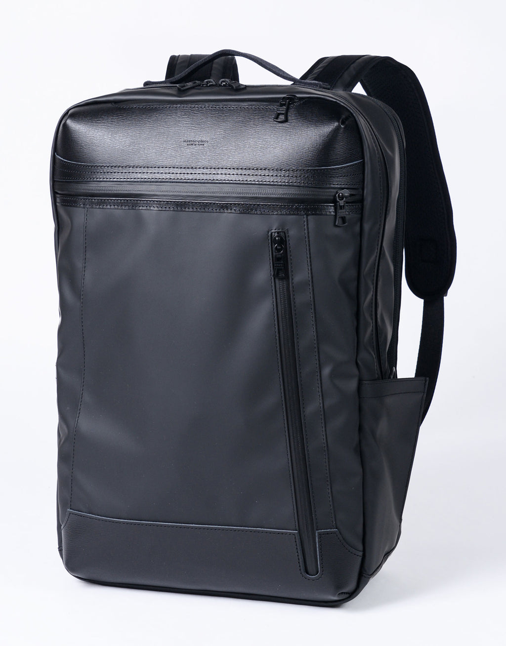 背面側にはスマートフォンなど貴重品の収納に適したファスナーポケットを備えています。