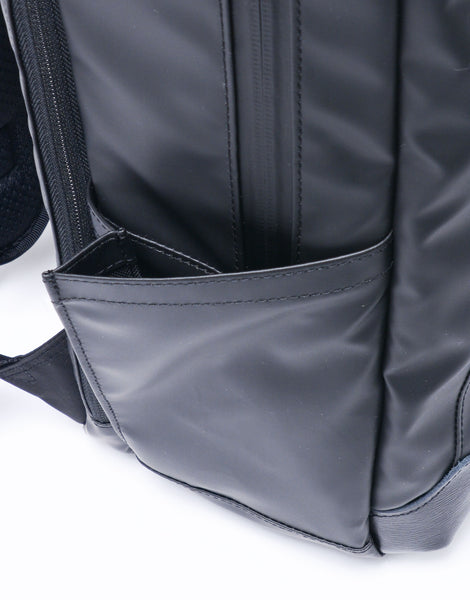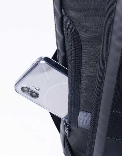 フロント上部のメッシュ式ポケットはワイヤレスイヤホン等の小物の収納に便利。