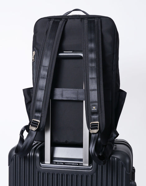 背面のテープにより、スーツケーツのキャリーバーにバッグを取り付けることができます。